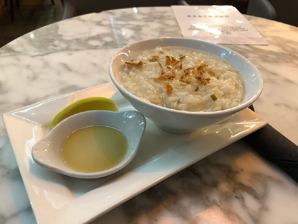 The promised food arrives promptly; it’s a dish of chicken and rice that’s kind of halfway between a soup and a rice pudding, and the internet tells me it’s called Arroz Caldo – as does, subsequently, the Filipino version of the table reservation sign. It’s very nice.