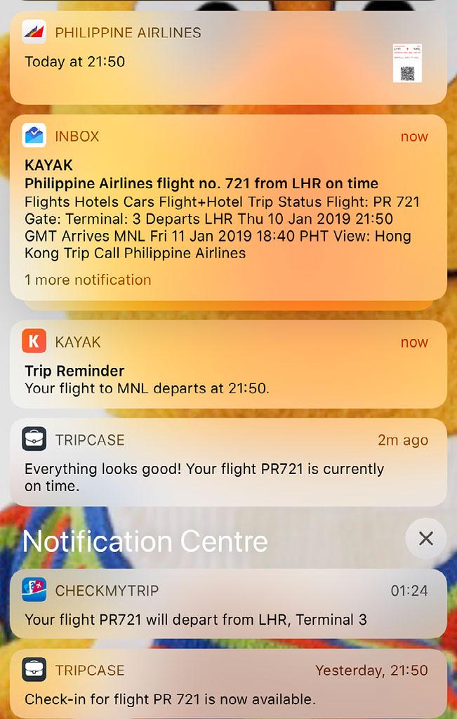 My phone has been going mental with notifications all day, making me think perhaps I should remove an app or two. Do I really need all this? At least it’s reassuring that my flight appears to be on time.
