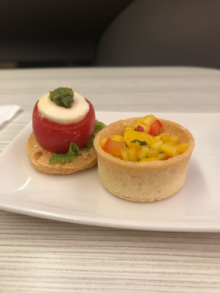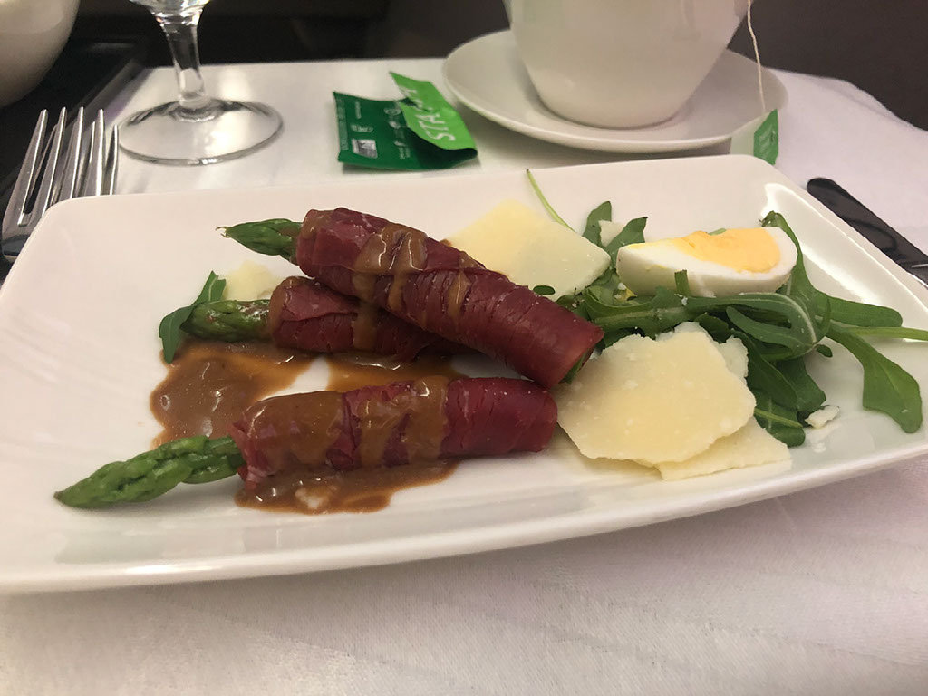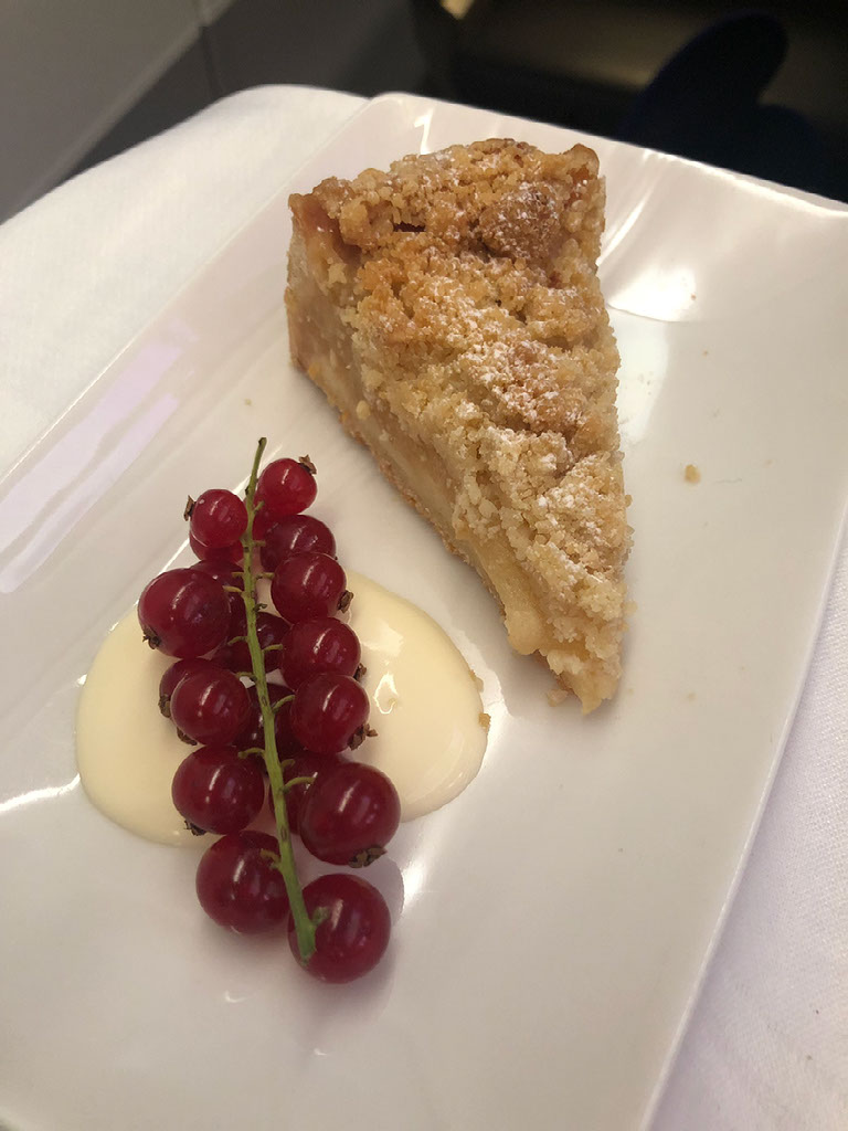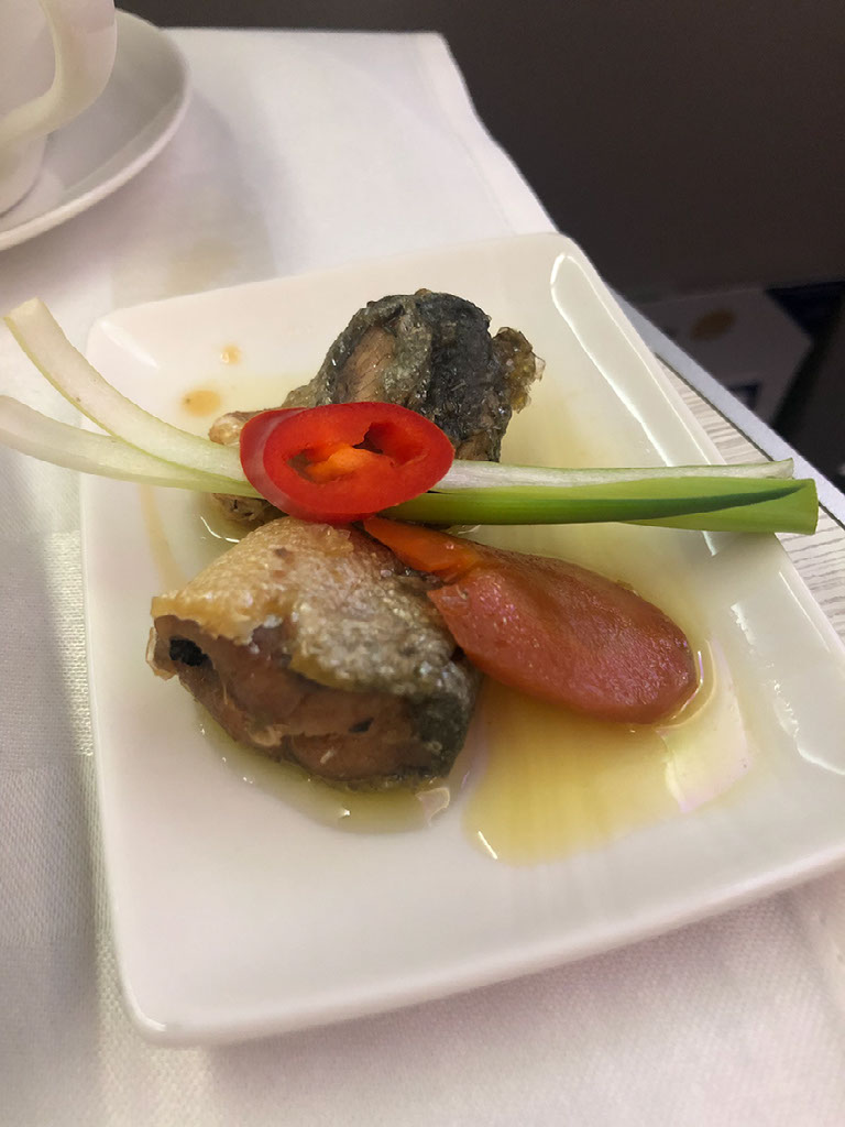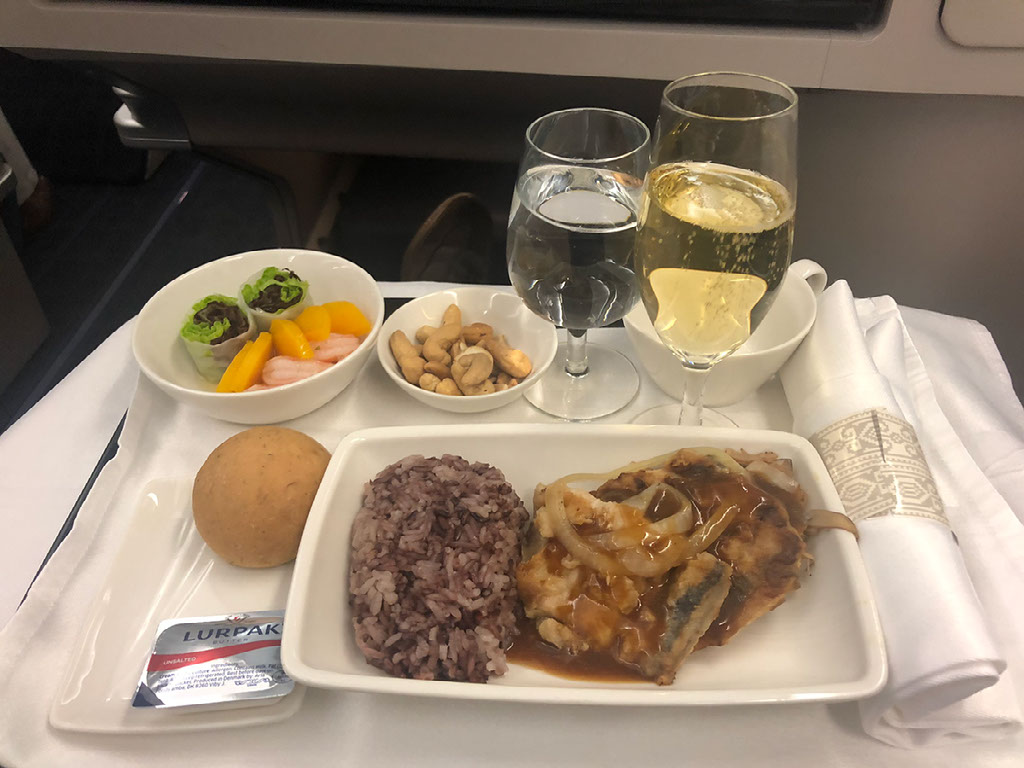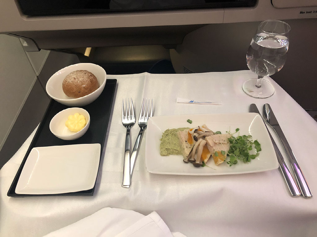 Food comes out almost immediately once we’re airborne, and the service is pretty epic considering this is only a 1h20 flight. It all comes served at once but there’s a bowl of nuts, my pre-ordered champagne, some bread, a starter, the main, and some dessert.