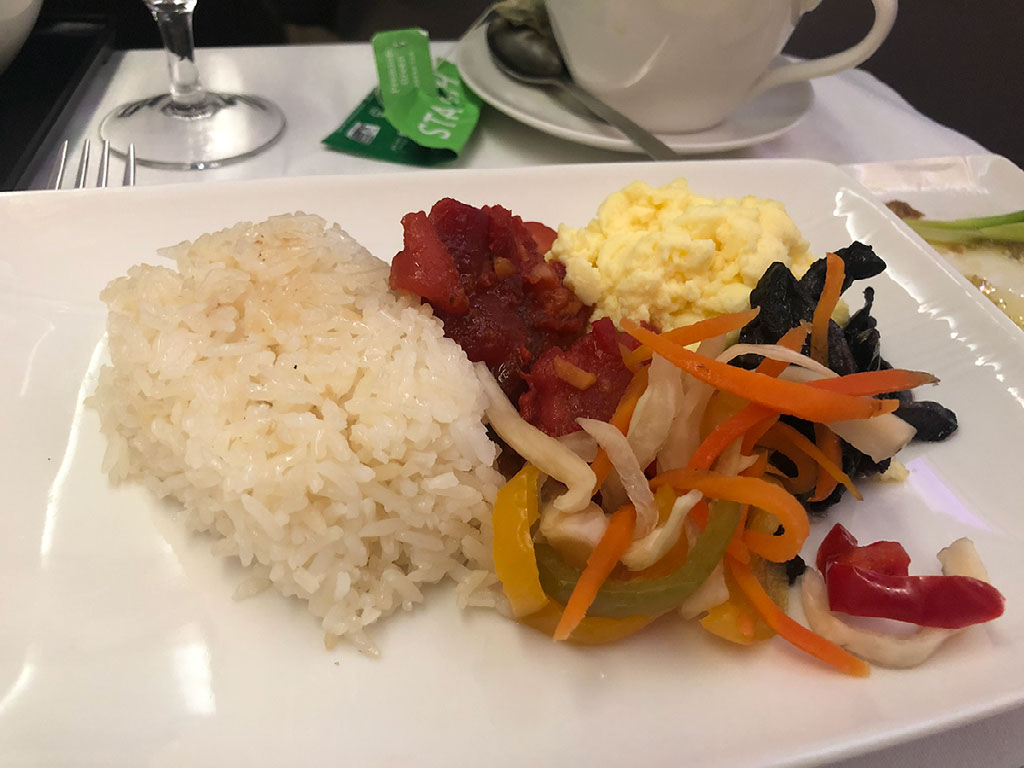 This is the Filipino breakfast of rice with scrambled egg and veg and chorizo that I did order. It’s very nice.