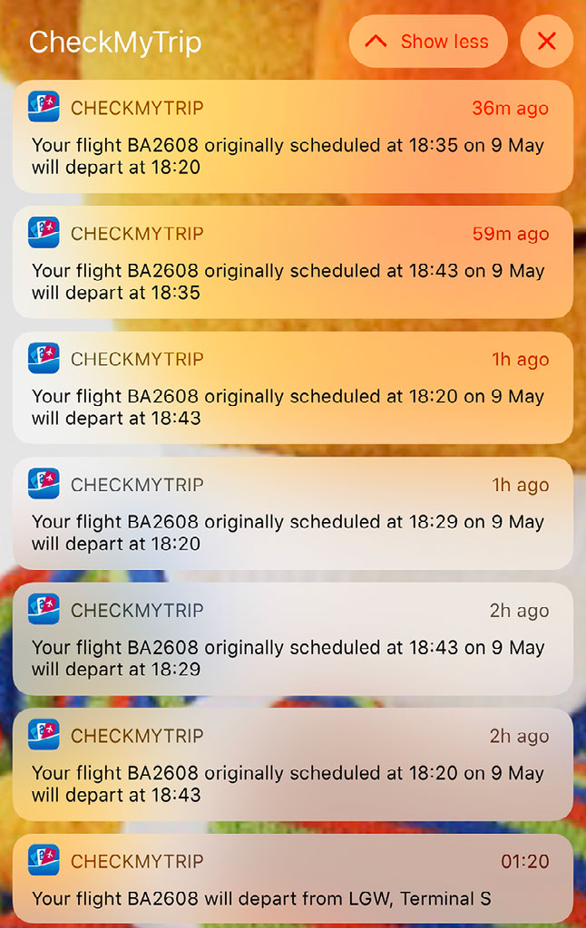Getting words in between this relentlessness were alerts from the Gatwick app, and BA, all telling me that due to a French air traffic controllers strike stuff might be delayed. Huh. We were already scheduled to arrive at just gone 10pm, arriving much later than that would be very suboptimal. Hmm.