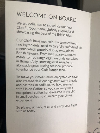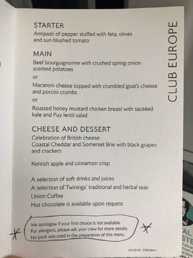 Whatever. We’re on in fairly short order, find space for our bags up top and plonk down in seats 2D and 2F. Once boarding is complete we see that business class is very empty, only 5 seats of 16 occupied. We’re given menus for our food choice, which tickles me and I don’t know why.