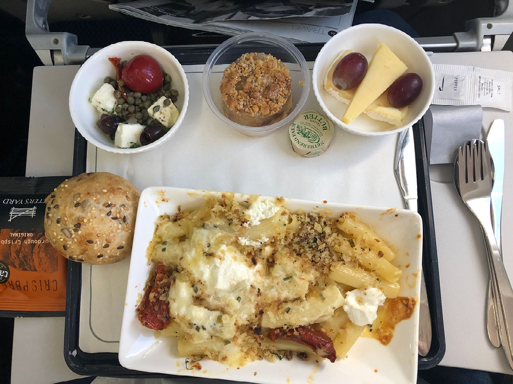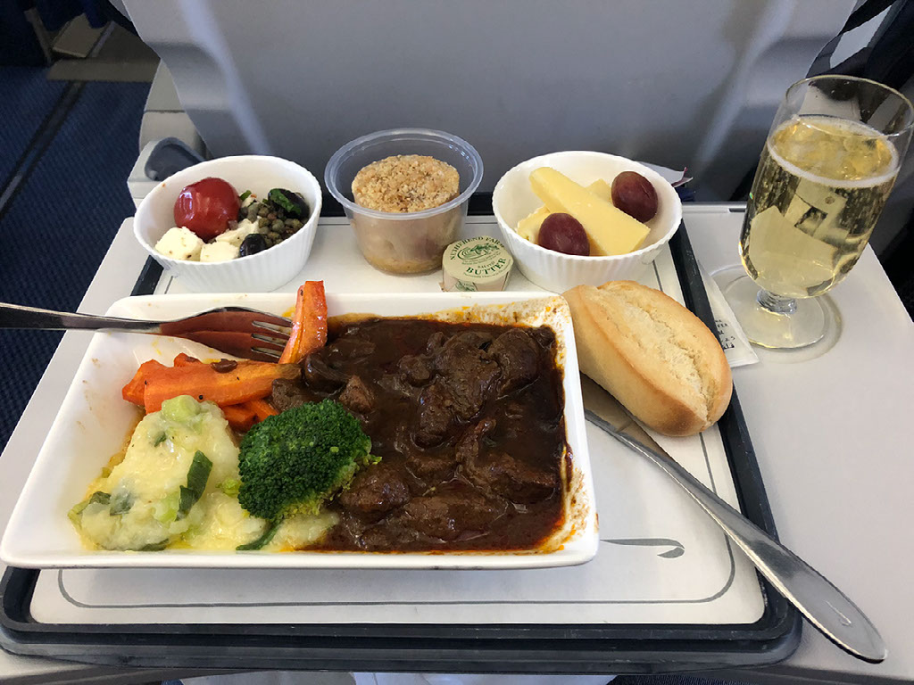 When service starts, the cabin crew serve the man in row 1 first, then the folk in row 3, and finally us in row 2. Huh? I’m distressed by this, but when we are finally attended we are each referred to by name and service is disarmingly friendly. I’ll have the macaroni cheese please.