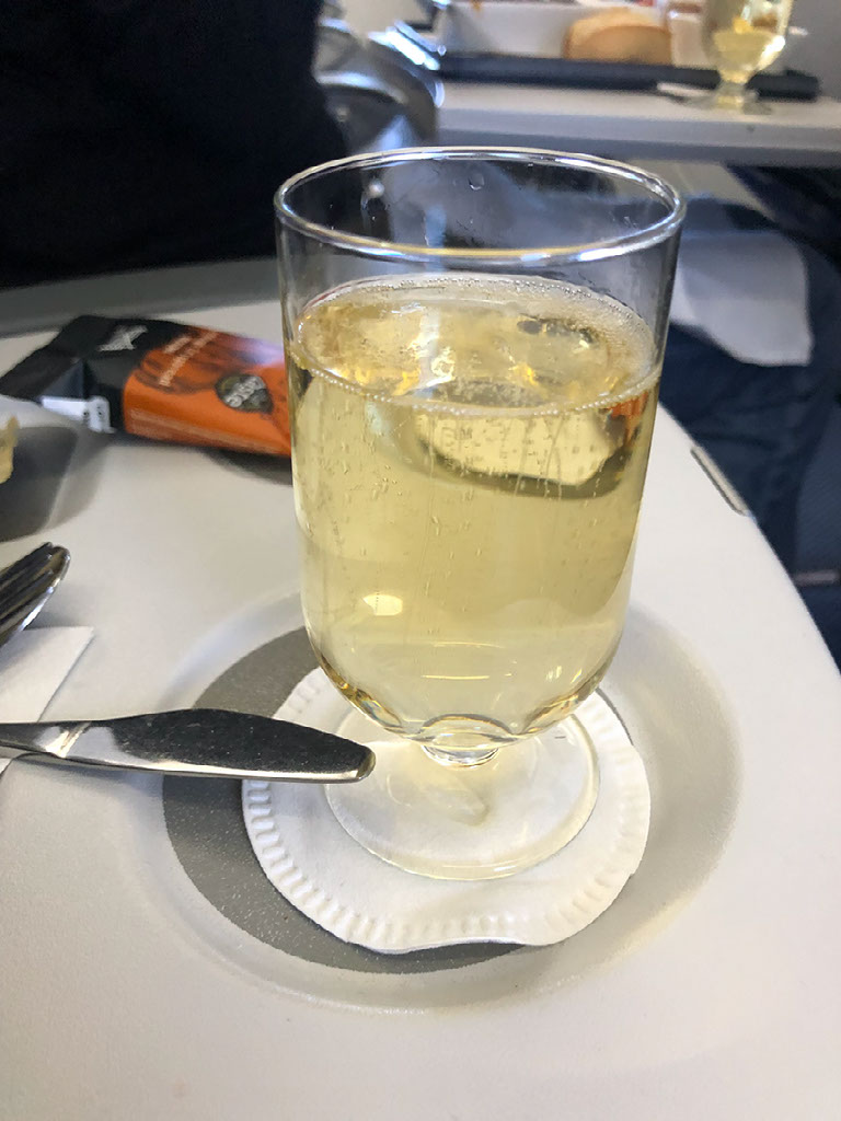 A (very) hot towel is offered just before we push back, 25 minutes after scheduled departure. Our captain has informed us about the ATC strike and that we’ll be avoiding French airspace, but even so are likely to arrive on schedule.