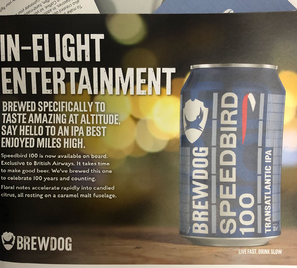 Actually, that’s not obvious. 2019 is BA’s 100th anniversary and to celebrate that fact they’re doing all kinds of marketing shenanigans, including having partnered with BrewDog to commission an exclusive IPA designed to suit airborne tastebuds. It’s called Speedbird 100 and they’re very proud of it.