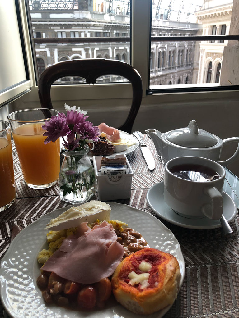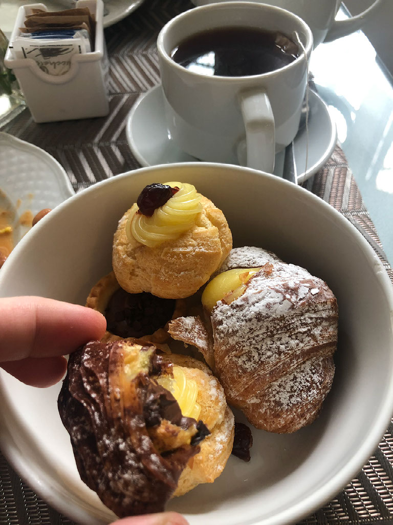 It was a great choice. We had a table next to the window looking into the Galleria below, and the breakfast room is full of buffet items. There are scrambled eggs and a mysterious (and cold) bean based dish; plates of cold meats and cheeses; and many, many, pastry goods both sweet and savoury. Plus mini-pizzas.
