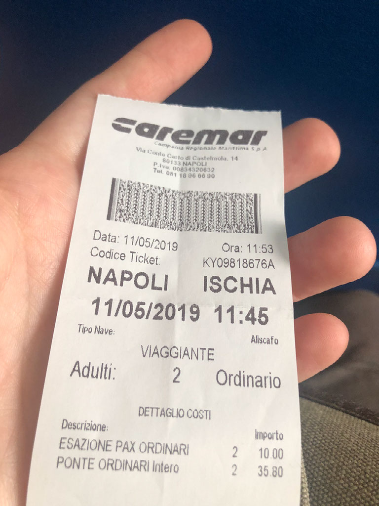 Ischia is only another 10 or so minutes away, at about 1pm. Everyone piles off and there are loads of taxis about though the drivers aren’t aggressively trying to get people in. Our first plan is to go buy tickets for the return boat, since we want the last one of the day that goes back to Beverello (there’s another Napoli port but it’s much much less convenient), and given how crowded things are we want to ensure we get our space.