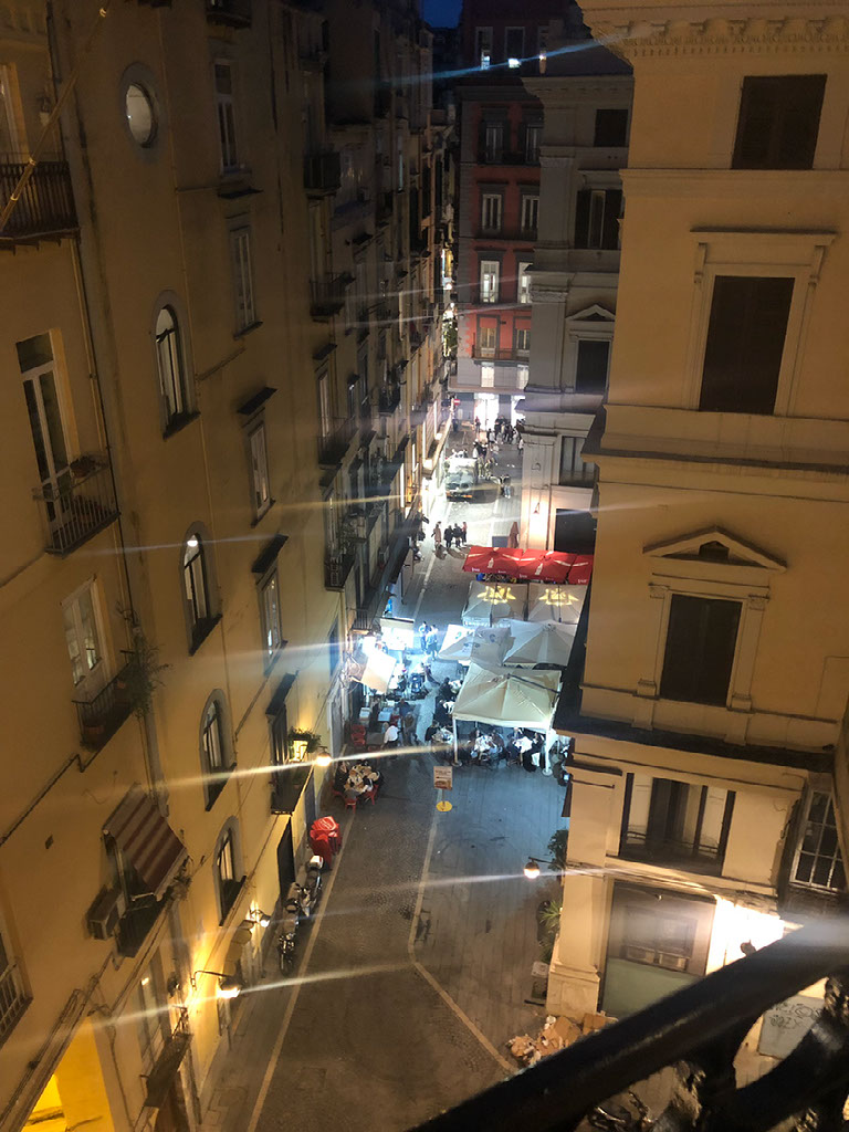 As we walk around its outside we notice a large group of people waiting just inside the entrance to the inner courtyard, as if A Happening is happening. So we go and loiter at the rear of the group, unable to figure out what the deal is. There’s a sound stage with music stands and some seating so perhaps a classical music gig or summat? I recall that throughout May Naples has this kind of Open House thing going on, with loads of bits of the city opened up that aren’t usually. But the internet isn’t forthcoming about exactly what’s going on here and it doesn’t really matter since neither of us want to go to a gig.