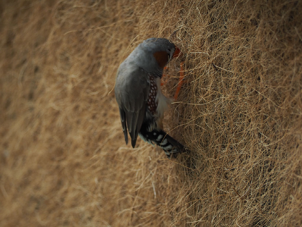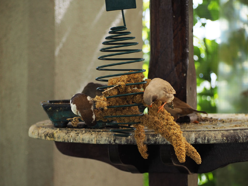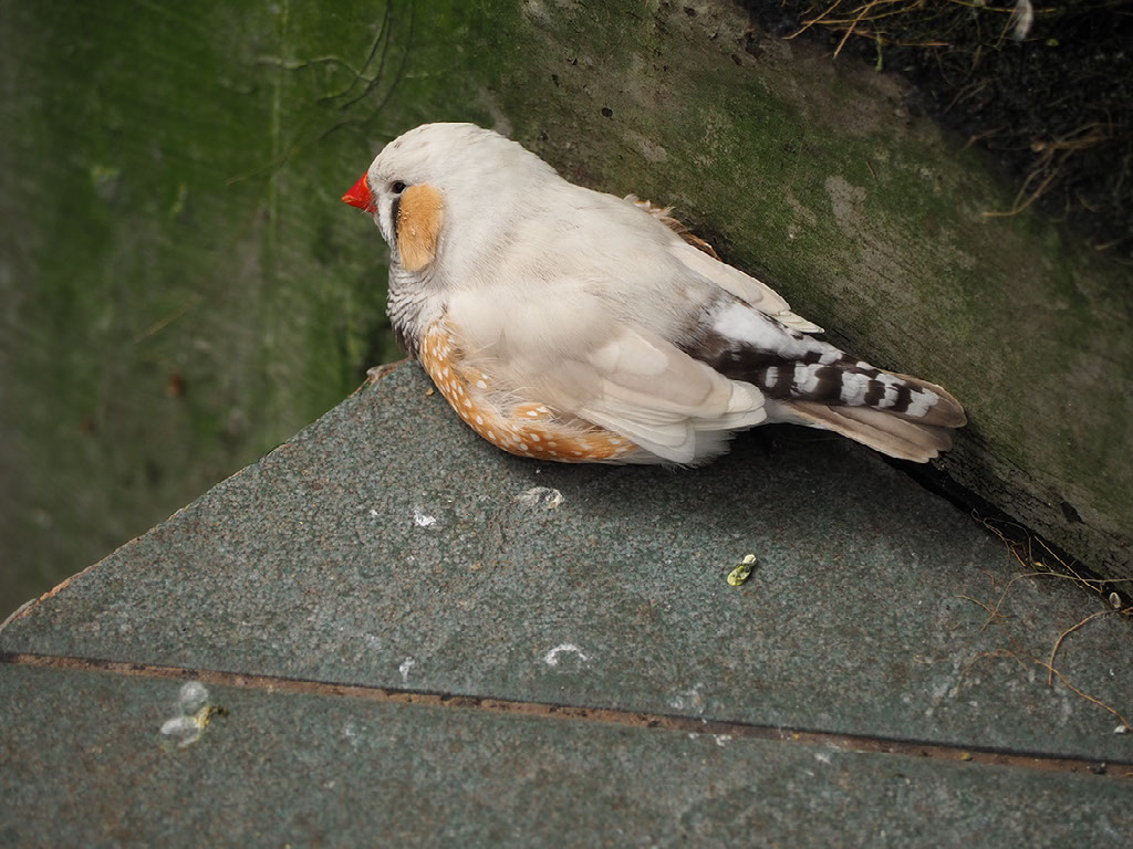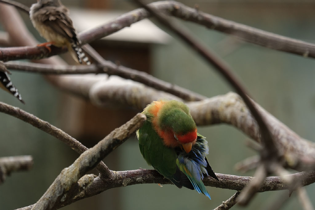 Helen almost gets a wonderful picture of one of the parrots, only to be photobombed by a blurry finch. D’oh.