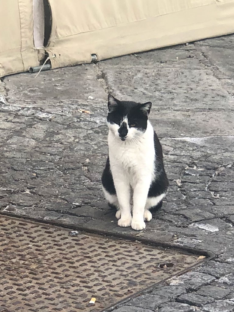 It’s a quick ride back to the port. There’s a street lining the side of the harbour that’s full of restaurants, but not being a time of day when Italians eat, half of them are shut and the others are very empty. We walk all the way to the end, past another couple of timid cats.