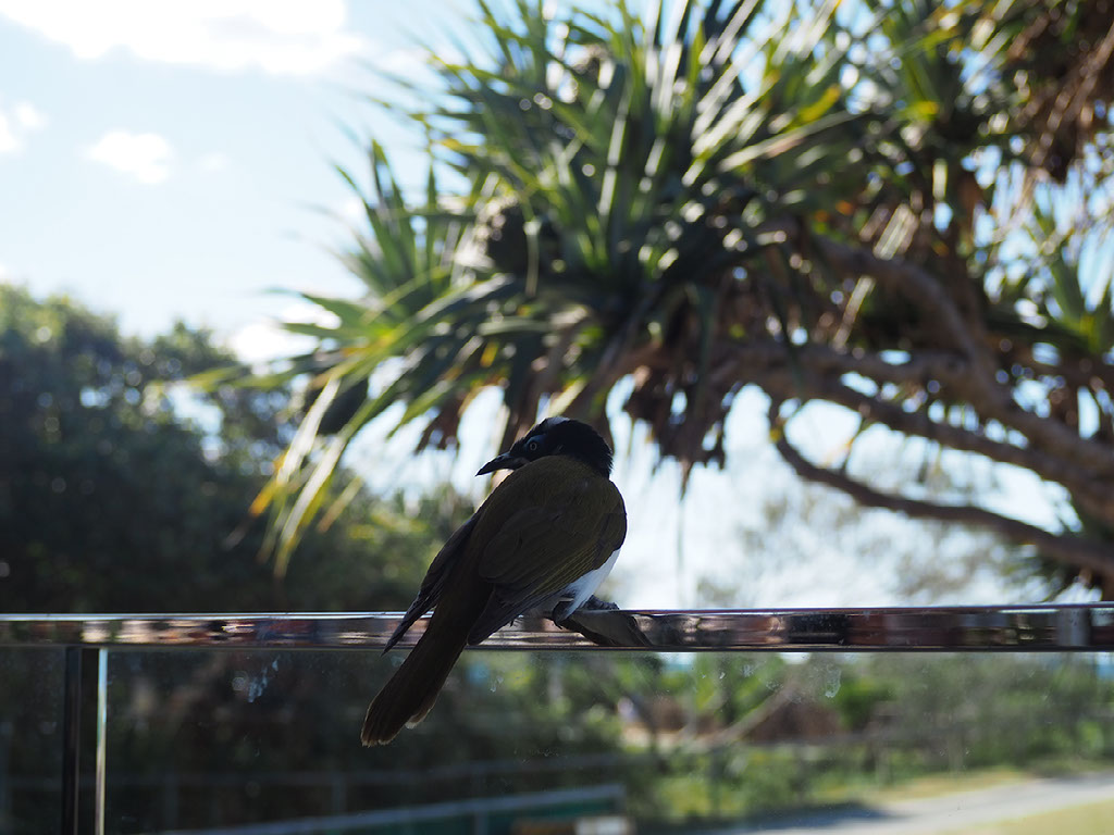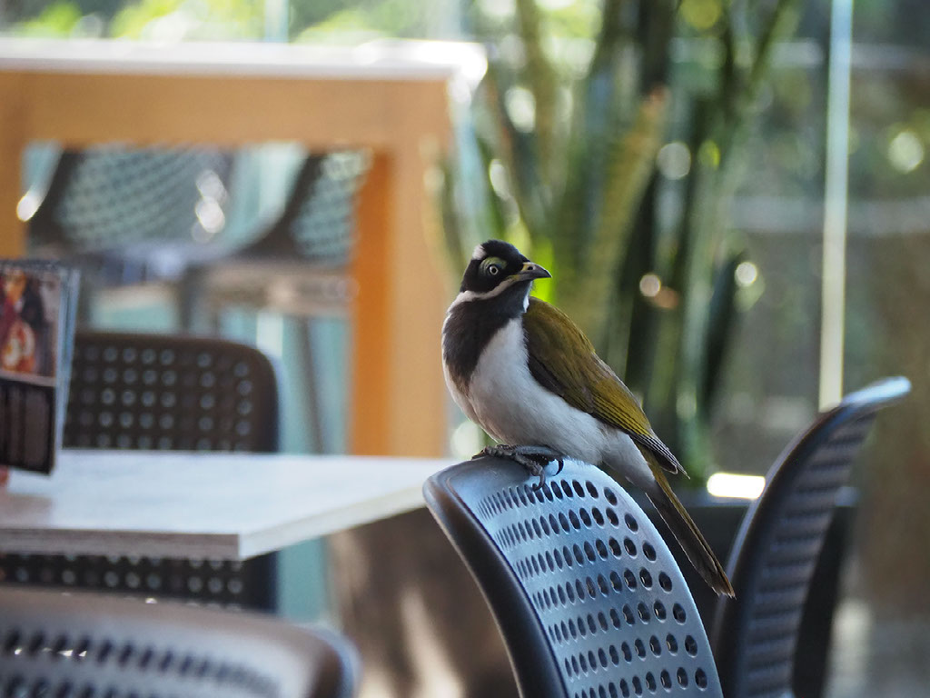 Blue-headed honey-eaters, which a couple of days ago Kevin had said were moderately rare to see up close due to their shyness, are all over the place. They’re hopping around on the fencing and on nearby tables and chairs and they’re not flying away even when AJ takes my camera to go take a picture.