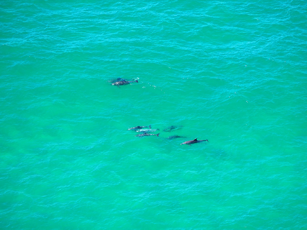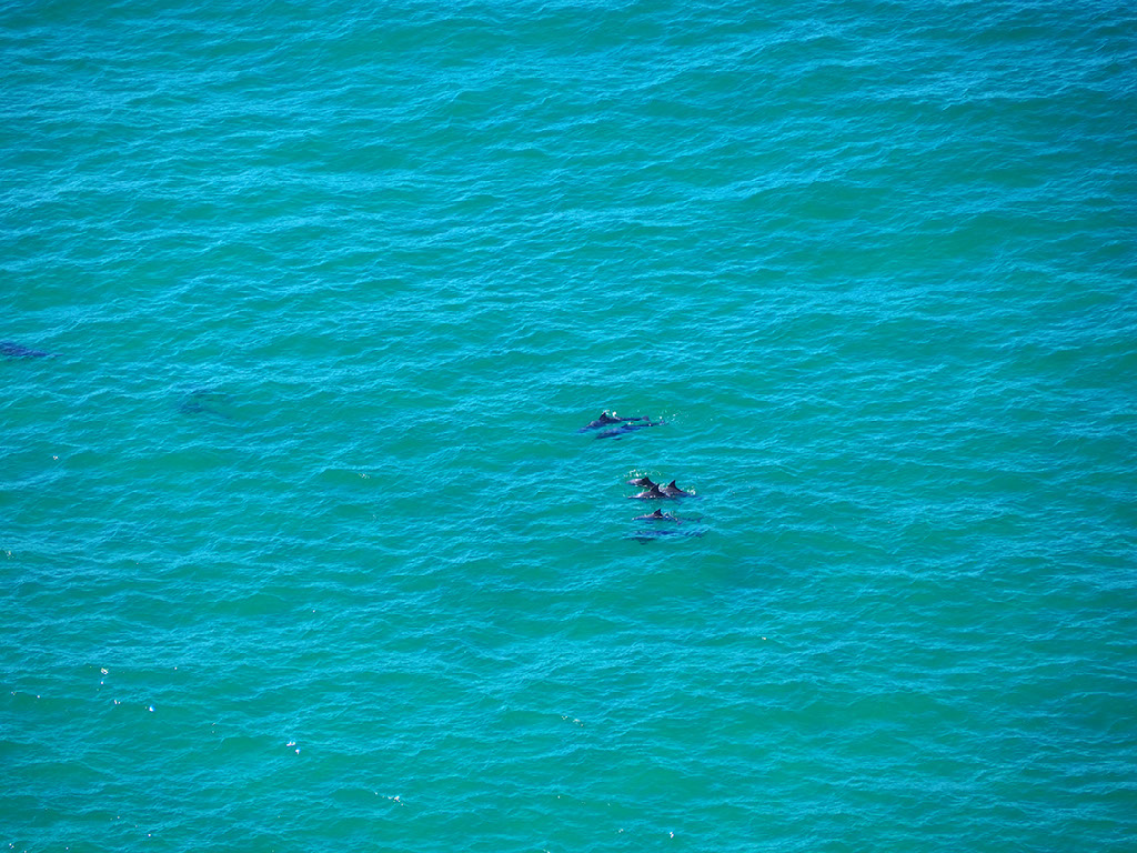 Tracing our way back down, Kevin jokes that he’s pissed off we didn’t see any dolphins. Then a nearby kid says there are dolphins about, and looking over the fence we see a bunch of dolphins in the clear water very close to the shore. Holy shit!