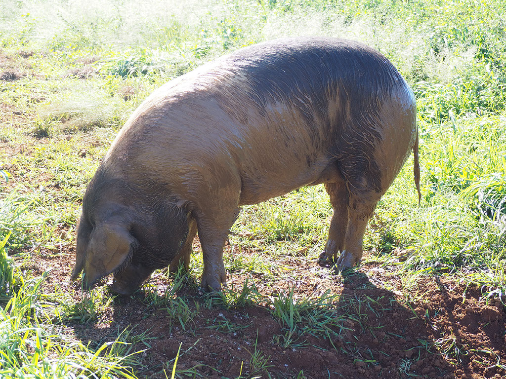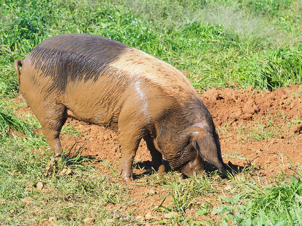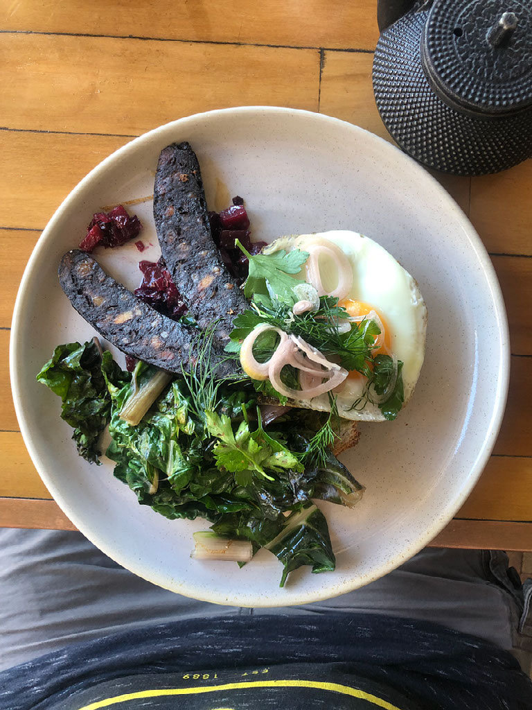 This is a working farm but with a track around the fields where the animals live, but before any of that I need to stave off my hanger. That’s “h-anger”, hunger-anger, not, like, a coat hanger. Anyway. Food. Blood sausage please.