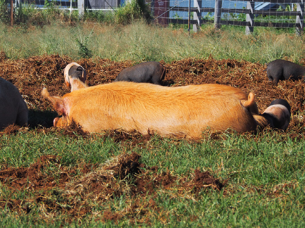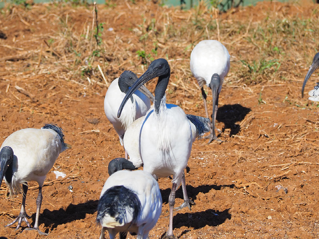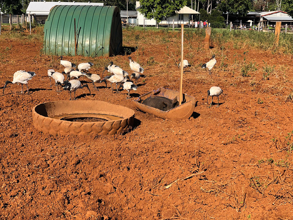 A piglet sits in its food trough while surrounded by ibis. Ibis? Ibises? I have no idea what the plural is. Both sound kinda OK. Whatever.