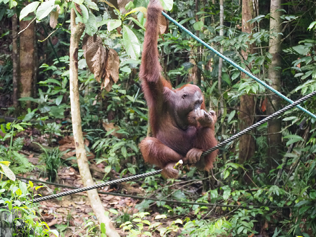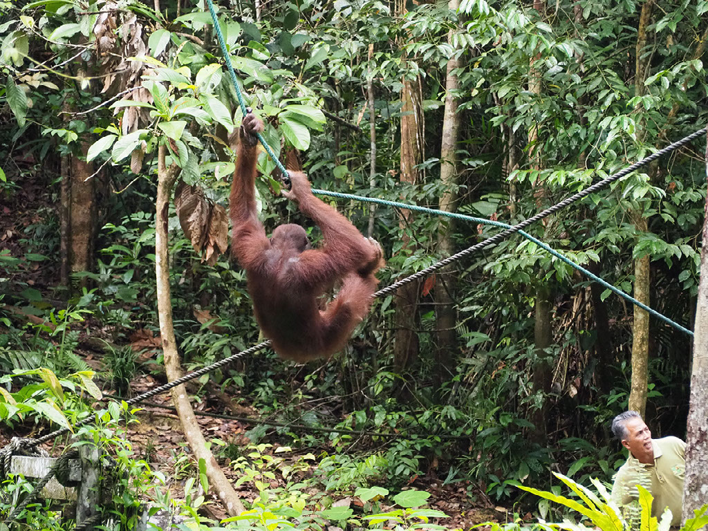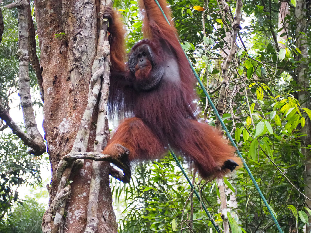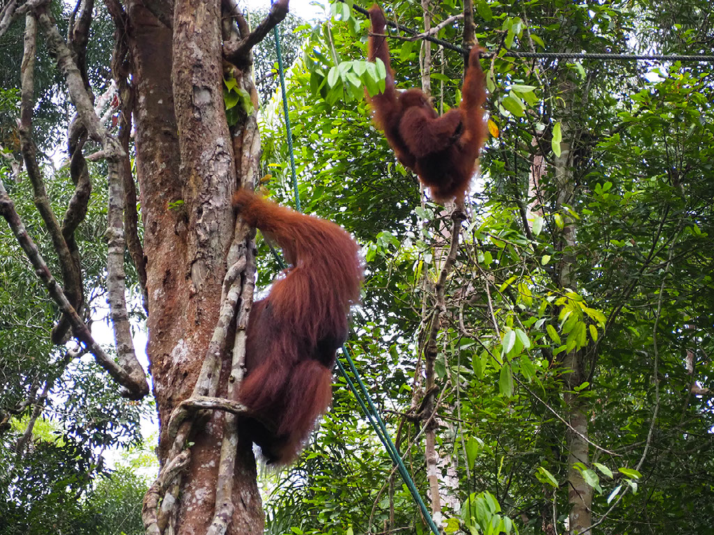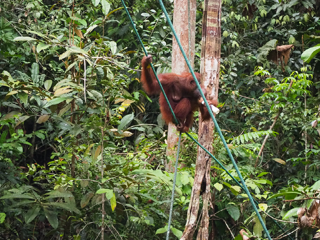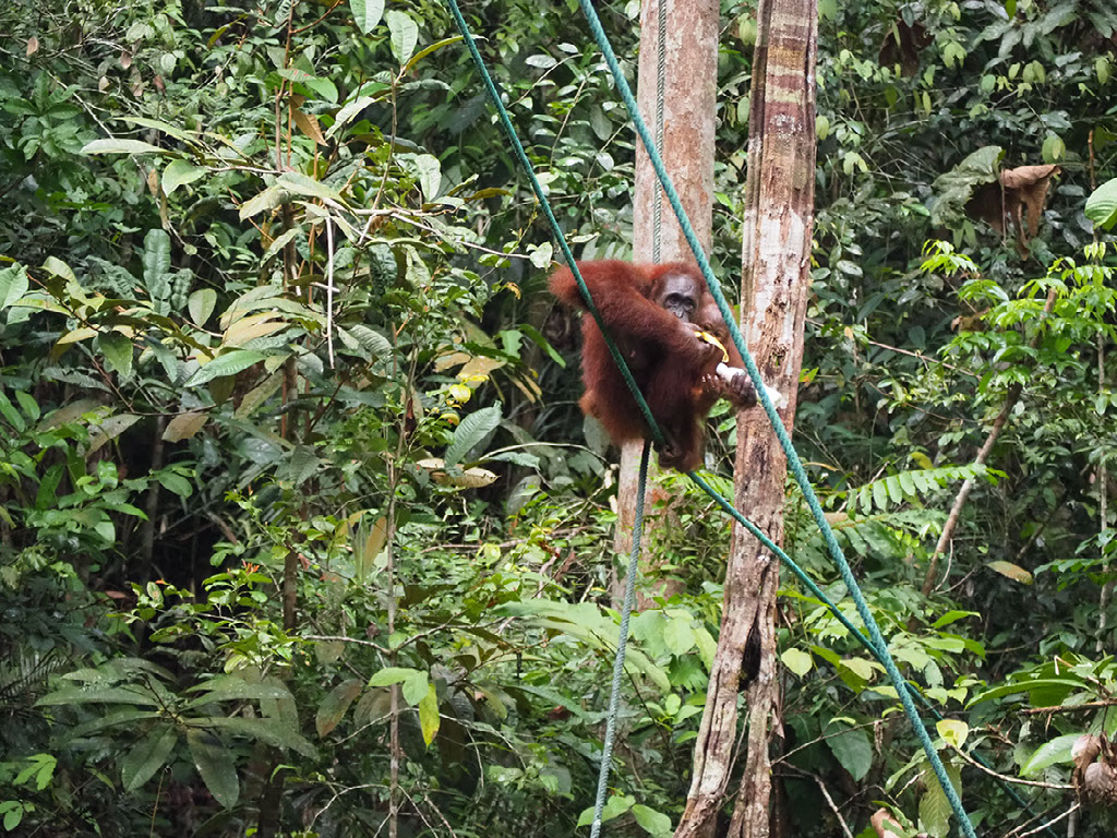 One ranger is feeding, and others are dotted around looking out for where the other orangutans might approach from – they might come across the floor we’re told, in which case get ready to skedaddle. But in the end they swing through the trees above and around us before making their way down.