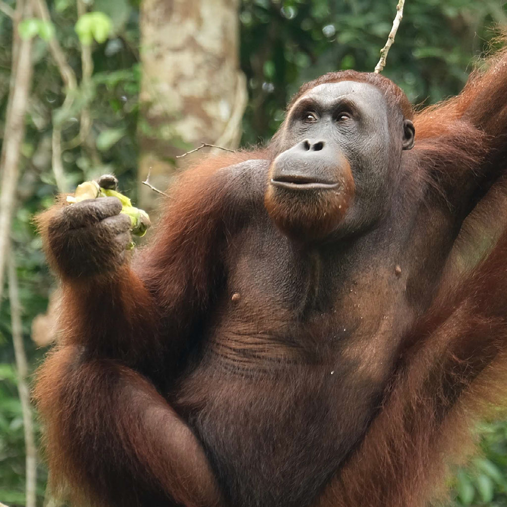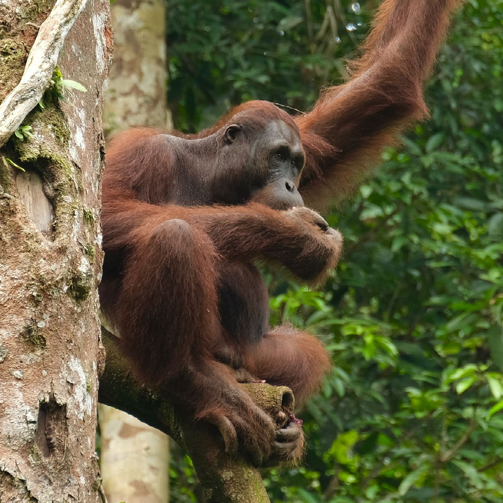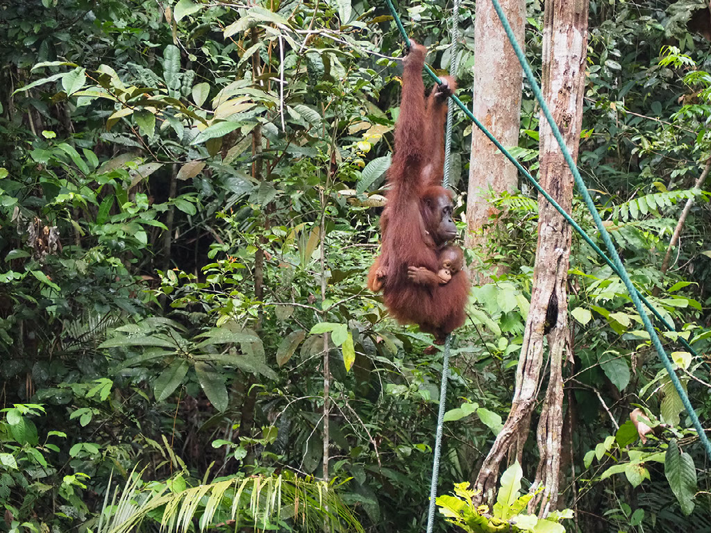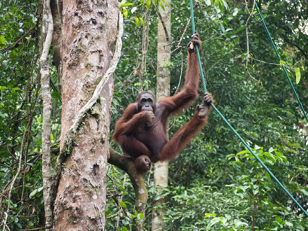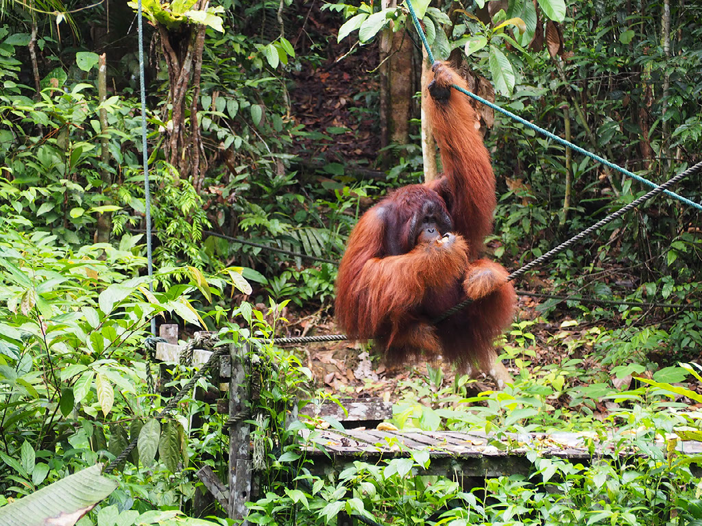 One ranger is feeding, and others are dotted around looking out for where the other orangutans might approach from – they might come across the floor we’re told, in which case get ready to skedaddle. But in the end they swing through the trees above and around us before making their way down.