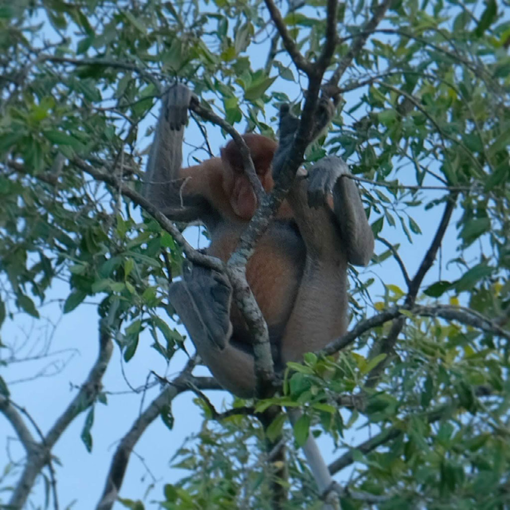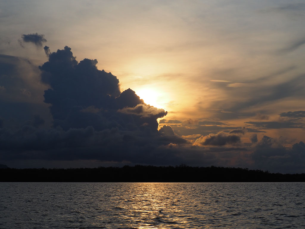 As the sun fully sets, so does a full moon set out its stall elsewhere in the sky. Again this is unusual for these parts, and not particularly fortunate: the last thing we’re being shown here are fireflies in a few of the trees down a third river. We do get to see them, but had it been darker the effect would’ve been much greater. It bothers us less than it bothers Anthony, who is a bit gutted with this on top of the lack of dolphins. We try and tell him it was just ace to have the river to ourselves for so long and see all the wildlife we HAD seen. Oh, talking of which, I forgot to mention the proboscis monkey.