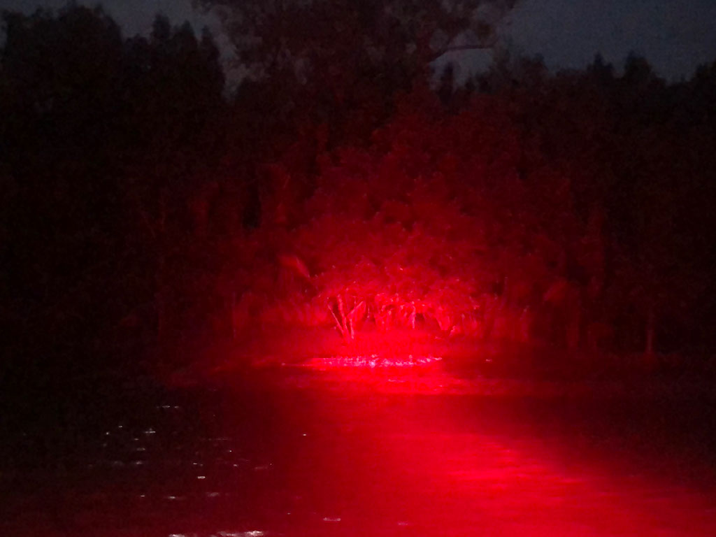 With the tour over post-fireflies, we’re warned that the boatman is going to properly put his foot down so keep a-hold of all our bags ‘n stuff. It’s dark and the boat has no light of its own, only the torches shone by the boatman and Anthony. We think they’re mostly using them for a mixture of navigation and just to let anyone else know we’re nearby, but in fact all the way along they’re still looking for crocodiles – and we see our biggest one yet, lying on the riverbank. We observe for a few minutes until the croc suddenly ups and legs it into the water.