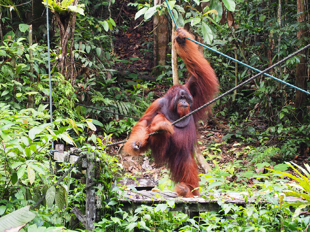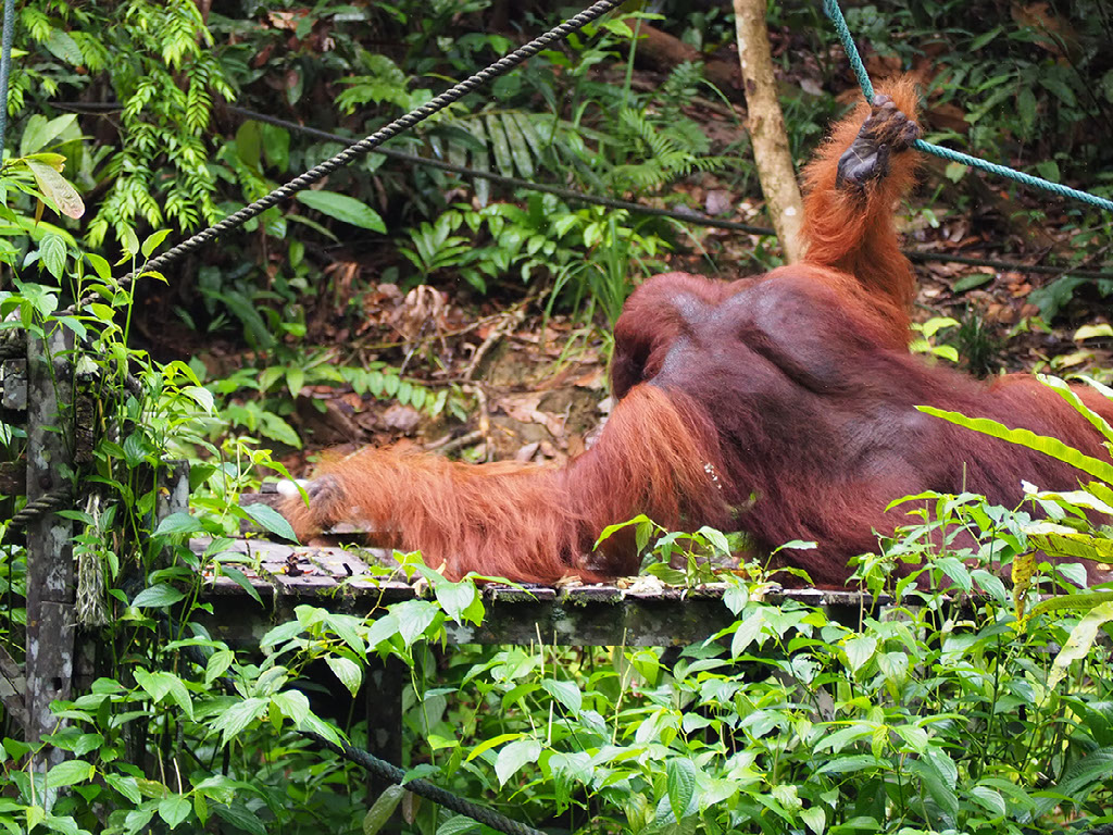 Come 10am and the proper safety briefing starts. Delivered by one of the park rangers, we’re told (or re-told, in some instances) that the orangutans are big animals, especially the alpha males, and if two or all three of them turn up at once we should do a runner for our own safety. The reserve isn’t actually big enough, really - one male would normally have a territory slightly larger than here to itself, so to have three males is asking for trouble. So the dangers of what we’re all about to do are repeatedly hammered home, after which the walkway to the feeding platform is opened.
