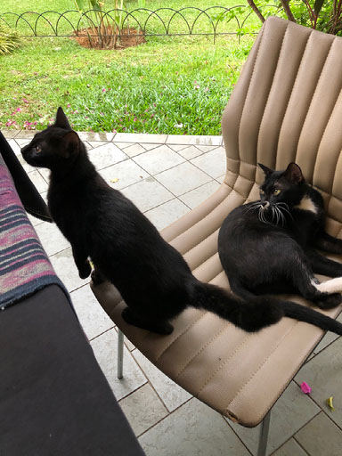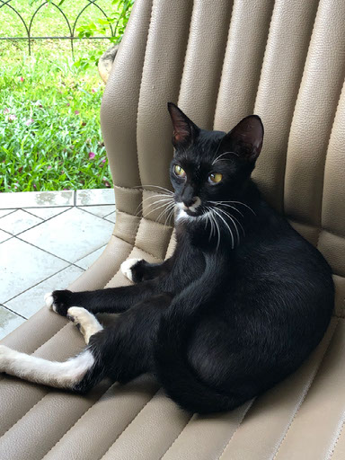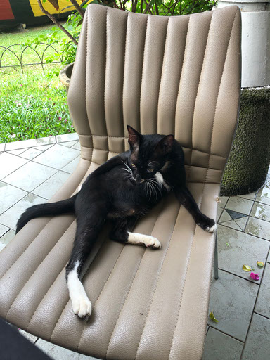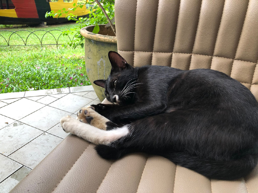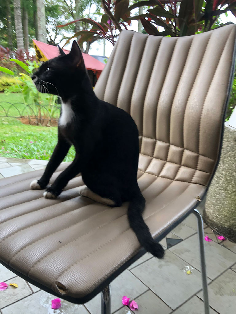 He startled me by being on the chair I was about to sit down on, as we chose a table with a nice view at the James Brooke bistro. Actually, that might have been a different cat, perhaps this one.