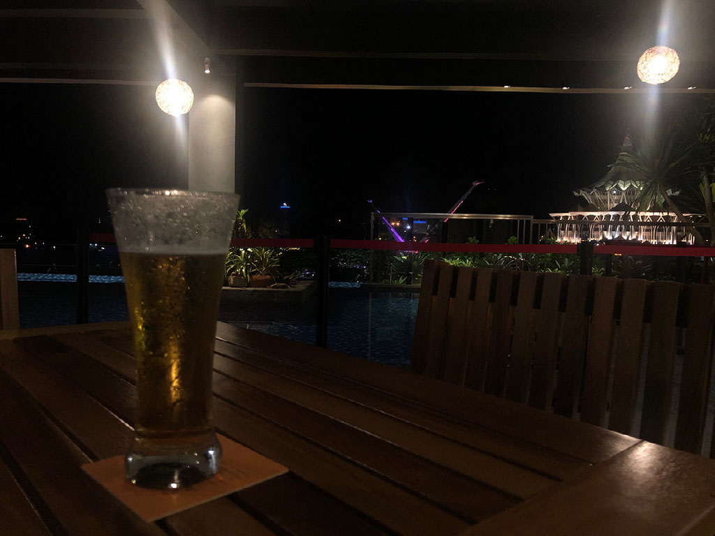 With darkness falling we went back to the hotel to change into less sweaty clothes before going out for beer. We knew about this place called Bear Garden, 50% of whose profits go to an orangutan rescue centre. Mixing beer with conservation makes me feel so incredibly righteous. Our route took us past a few fellas sat at a small table on the side of the road which was covered in empty Tiger bottles, at least 25 or so I estimate. Looks like they’d had a good Saturday.