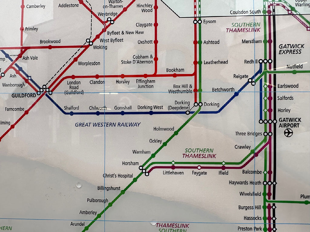 GWR service along the North Downs Line to Gatwick via Redhill and it’s platform zero. The sun was trying to burn the clouds off, but generally the view was of hills and farm animals covered in frost. Moving through Dorking I was minded to google “why does Dorking have three train stations?”. TL;DR: it just does, alright? They were built ages ago.