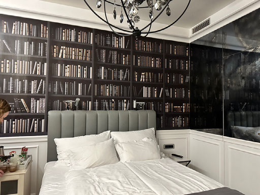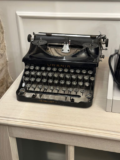 The room has a fake library wallpaper, and a typewriter. I really wanted to type this up using it, if only it had a bluetooth adapter.