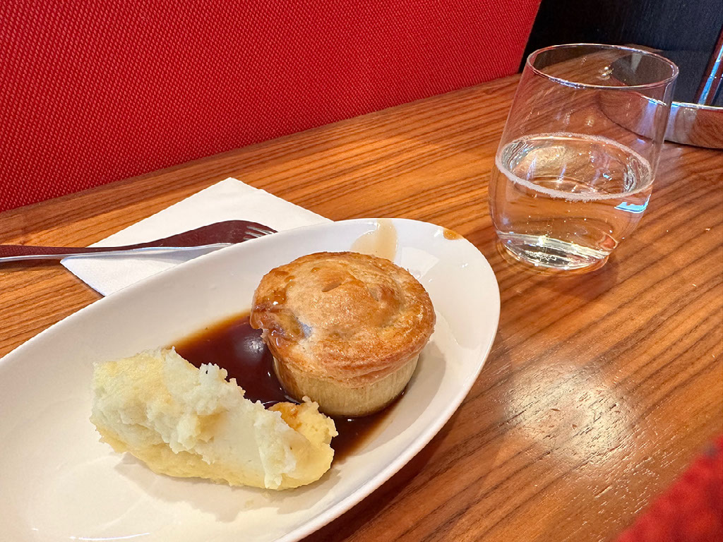 Lunch is pie, mash gravy, and a tumbler of prosecco. PROSECCO. Not champagne! Oh woe is me! Pfft. Once I’d wolfed that down, and Helen returned from her own sortie for calories, I got dessert.