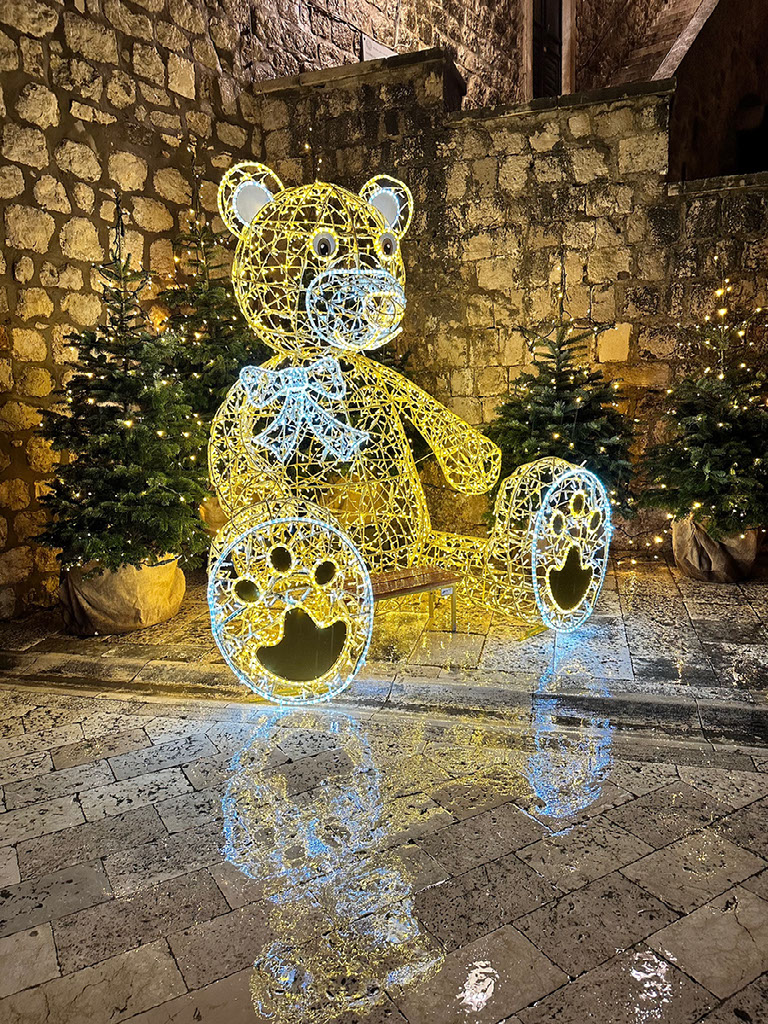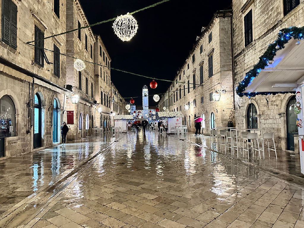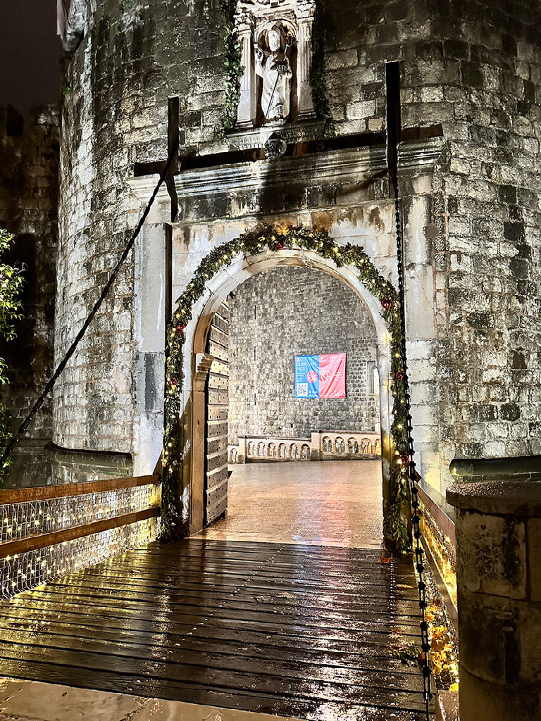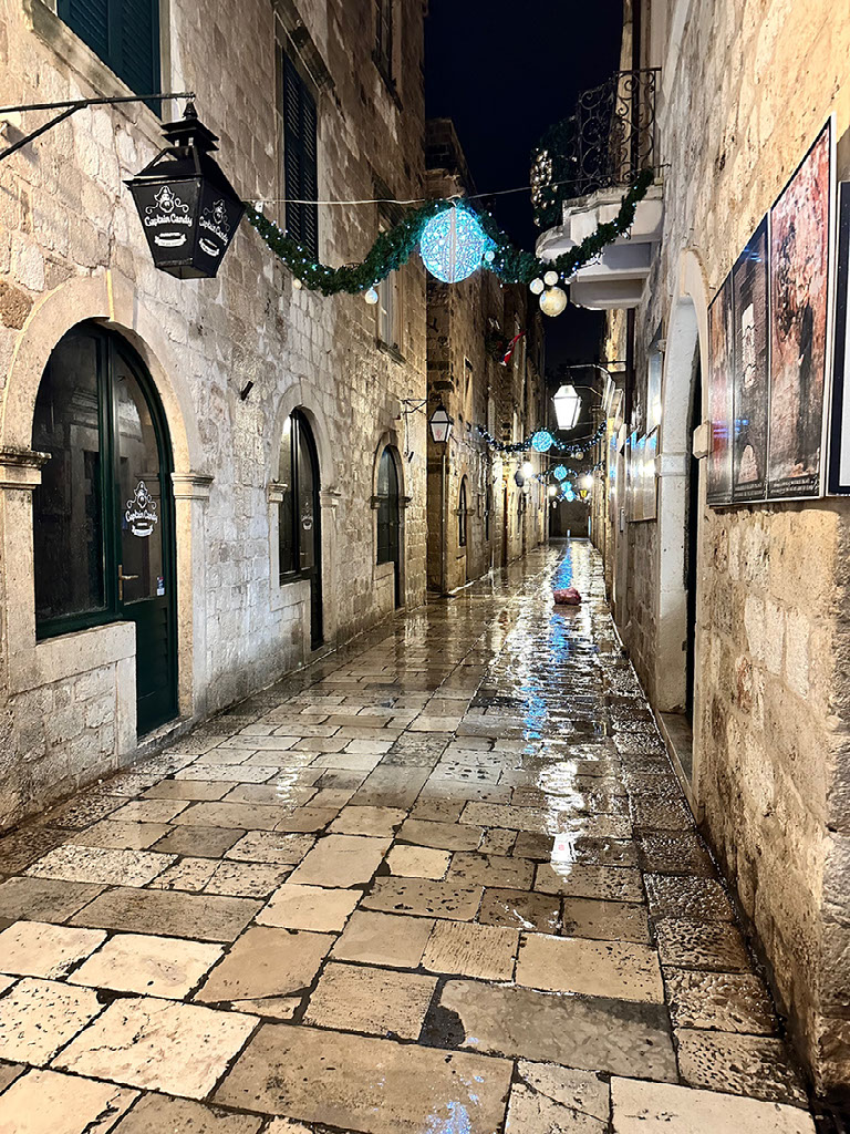 On either side of the main drag (the Stradun) there are these wonderful alleyways, flat to one side and with long, steep staircases on the other. It’s all very well lit up due to Christmas, but barely any of the businesses are open. We find the craft beer bar I want to visit, that closed at 5pm. There’s a “festival bar” which has someone playing piano way too loud. And there’s “Irish pub” which, meh, I’m years past seeking out the local Irish pub wherever I go. Unless it’s Ireland.