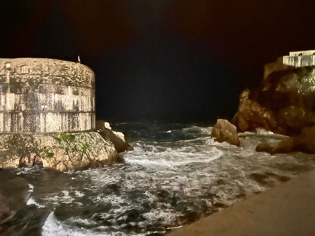 On the way back to the room we pop down to this bit just outside the walls, watching the pretty lively sea for a bit. Near us are a load of drunk, very very happy Croatian football fans. They only bloody beat Brazil, didn’t they? Amazing.