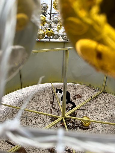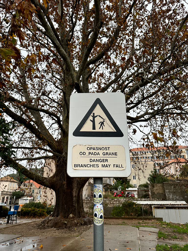Before we could even cross the drawbridge into the old town we were warned of falling branches by an excellent stick figure in peril, and then had our attention piqued by “hey, look at that cute stray cat!” - a cat which wanted nothing to do with us, and hid under the big christmas tree made of baubles.