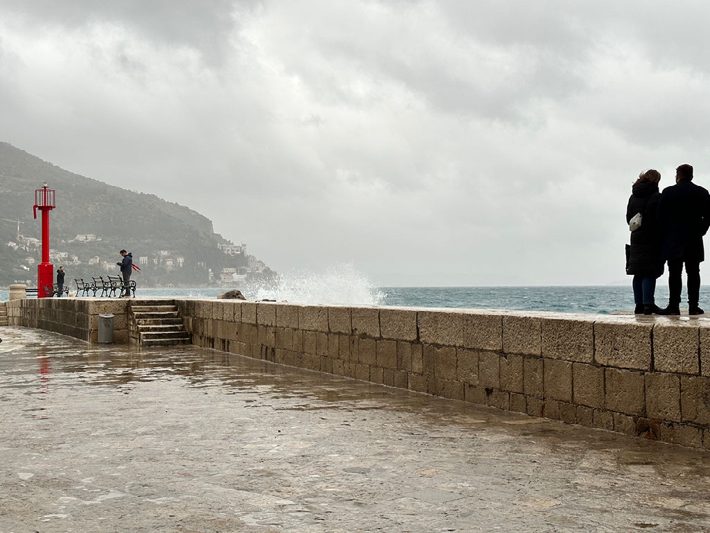 Skirting around the path outside the city wall to another pier, it’s very windy and the path is predominantly puddles. On the far pier there are a few other couples, and periodically the water crashes over it. One couple, fully cognisant of what they’re doing, walk up to the bit where the sea is most frequently making an incursion … and the woman gets utterly, totally drenched. Mercifully she finds it hilarious, because so I do, in a way I cannot hide.