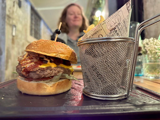 I have a beer and a burger. Helen has tagliata beef and a cocktail of sorts. It’s all very nice.