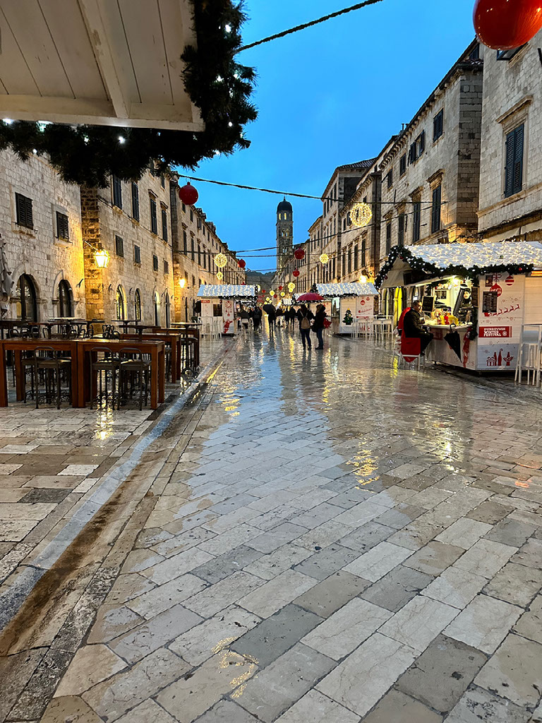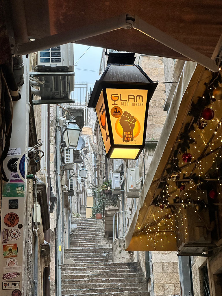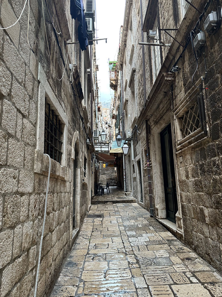 Pretty much as soon as we’d arrived and sat down undercover, there was BIBLICAL RAIN. It utterly hoofed it down for the entire duration of our visit, and stopped just as we paid up and said our goodbyes. Marvellous. Oh, also, some young kids came down from further up the alleyway, armed with a walkie talkie through which beer orders were relayed. Good work, lazy Dubrovnik adults.