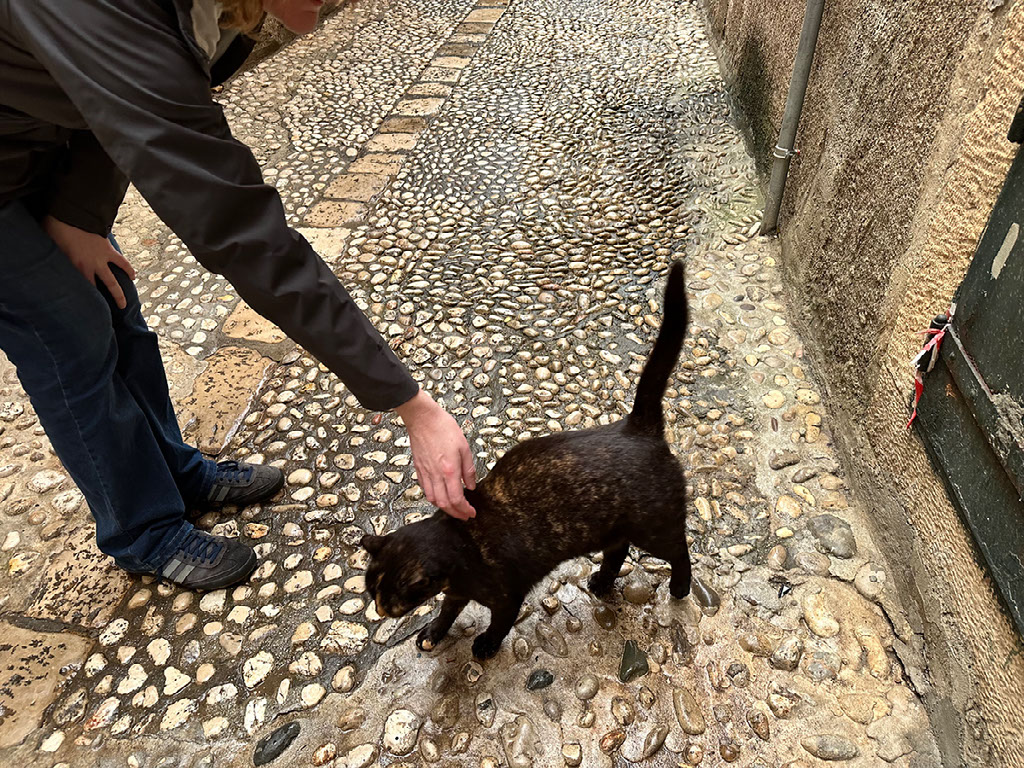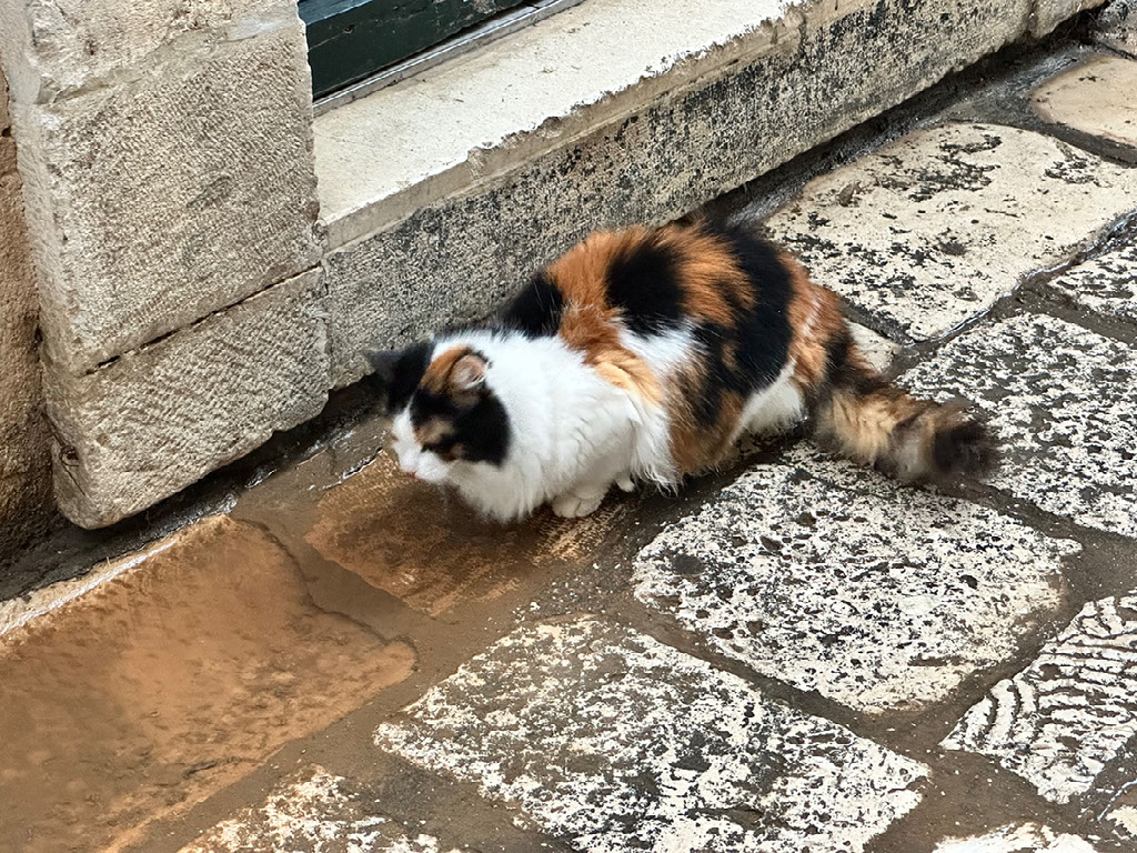 Anyway. I’m not being dismissive but as I say, I am not your guide through sober history, nor present sobriety for that matter. So. By the time we’re done exploring all the rooms, we’re actually genuinely hungry. About 95% of the city’s venues are shut but that doesn’t stop us suffering severe decision paralysis with the remaining 5%. Temporary respite from our failure comes in the form of being distracted by a puddle-drinking stray cat, who wanted nothing to do with us.