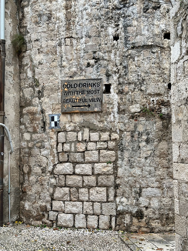We ascend, and ascend, and ascend, and ascend. We’re on the very edge of the old town just inside, and under, the old city walls. The “cold drinks with the most beautiful view” is closed, but anyway we were unlikely to walk down the perilous looking metal staircase to reach them.