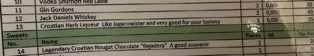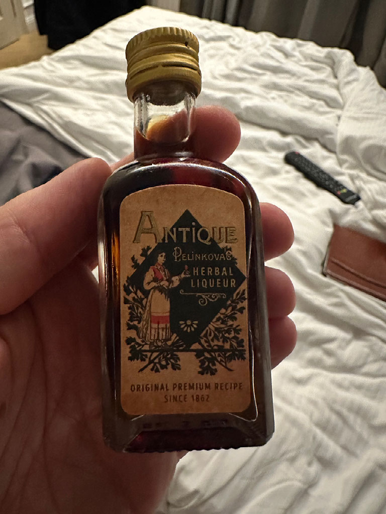 I decide a nightcap is required, and the minibar Heineken doesn’t quite cut it. But what’s this? A Croatian Herb Liqueur Like Jäegermeister and very good for my tummy?