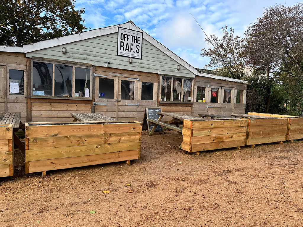 Emerging at the big crossroads with the M&S and Waitrose, I’ve only been out of the hotel about 7 or 8 minutes and I’m three quarters of the way to Parkrun. This is considerably too early. I thought about grabbing a diet coke from “Coop locale” but tbh I was already hydrated enough. So instead, I slowed my pace to an uncomfortable rate and descended a path down to the disused railway line. There’s a bar/cafe here called Off The Rails.