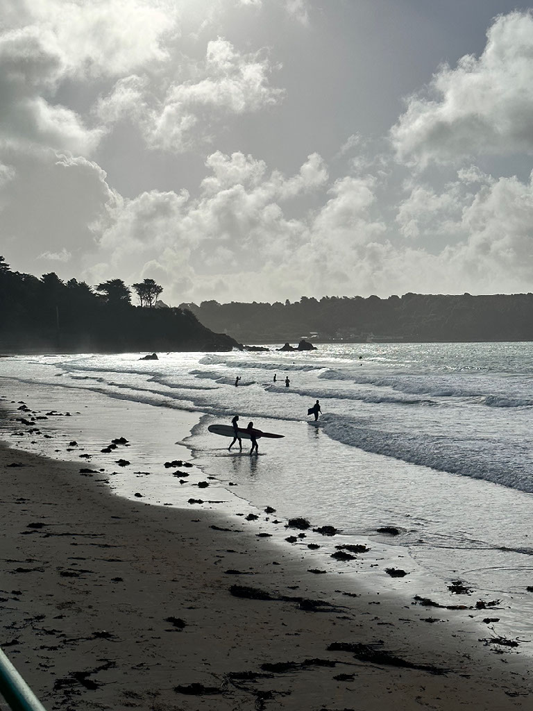 Helen went for a paddle. Some people were out on jet skis, others were windsurfing. Periodically there were snack shacks, and throughout it all we saw “le petit train” taking pensioners between St Aubin and St Helier.