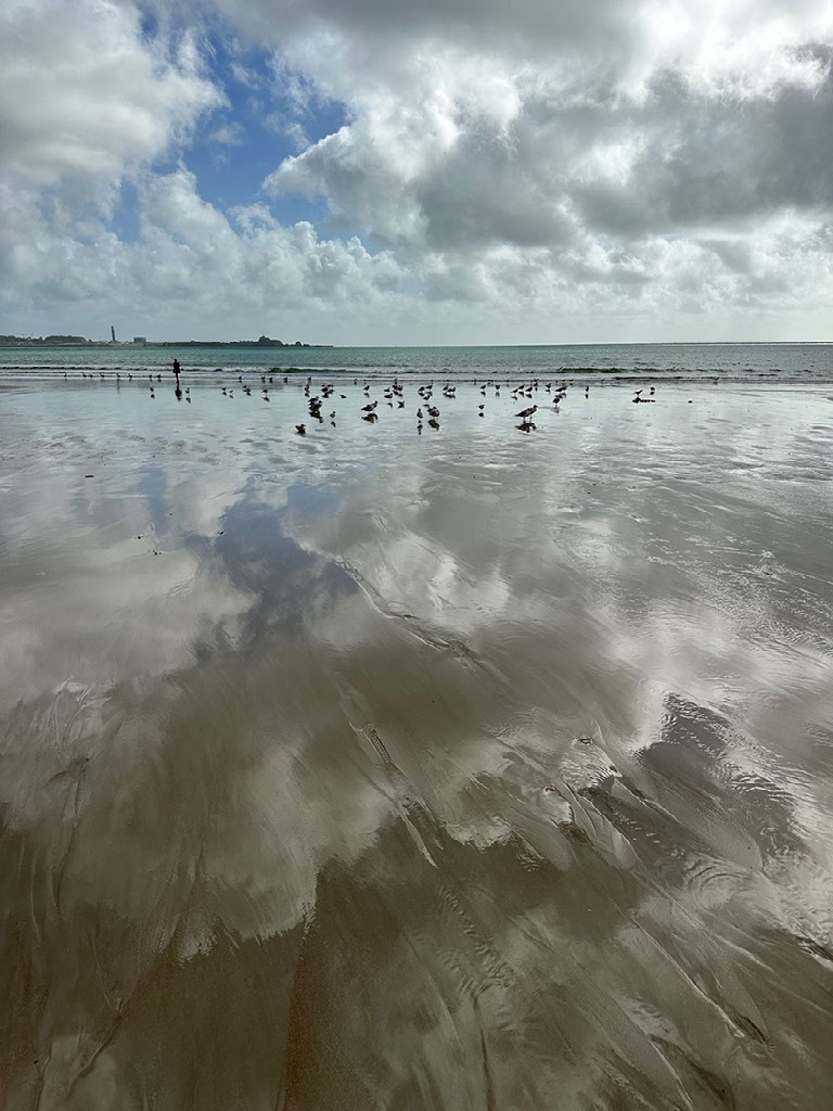 LOTS of seabirds. Helen walked basically through them, while I held back and copped a pic of the watery sand looking like glass.