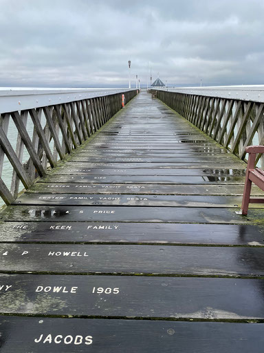 We parked outside one pub, and immediately went to our third pier in three days. There’s a cafe at the land end, and a small (closed) kiosk showing pier history at the far end. The planks have names of people that have contributed to it’s upkeep and general existence. The view back to land is of The George hotel and pub.