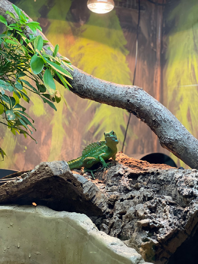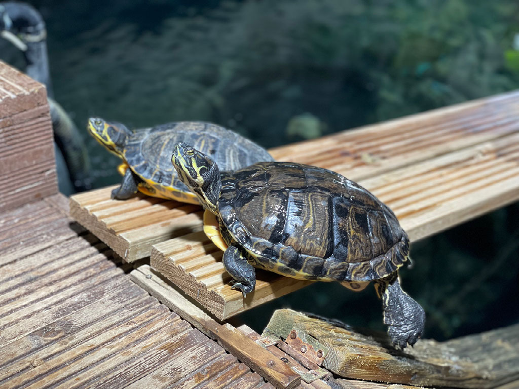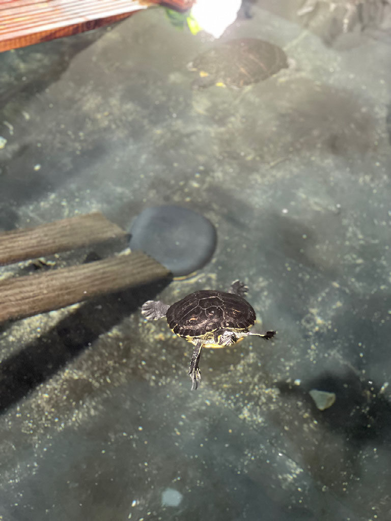 About 20 or so terrapins in a pool, with sunbathing lamps on the shore. These were quite cute.