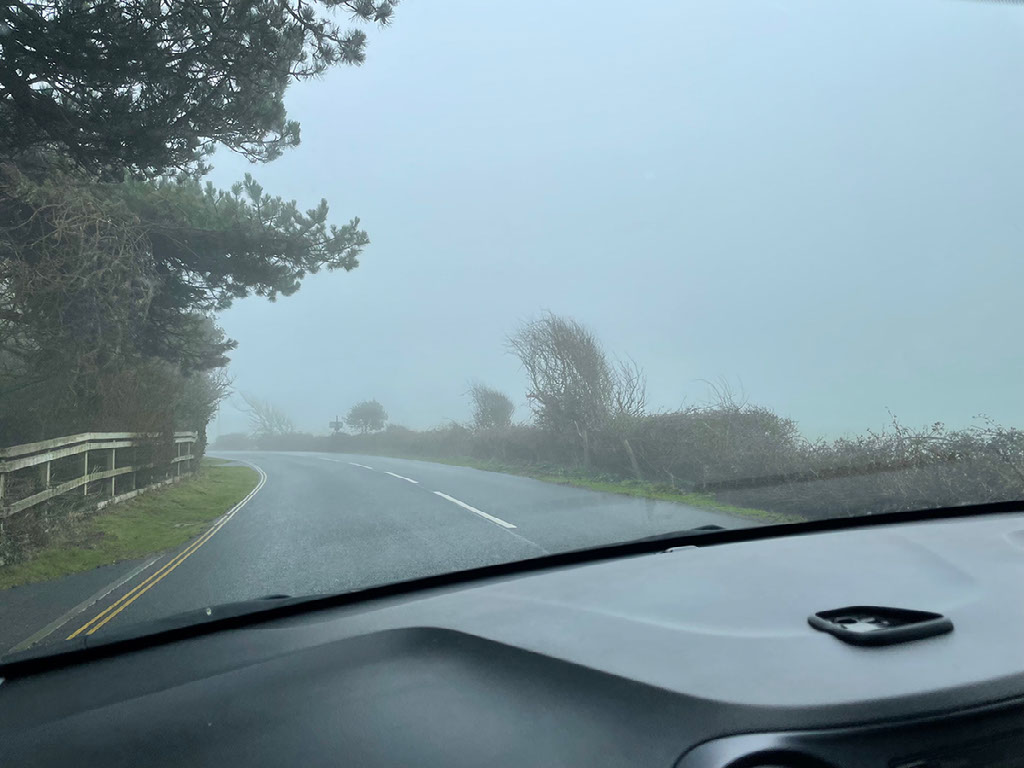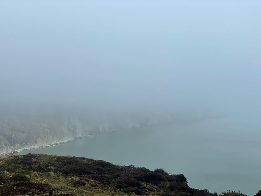A hundred or so yards on from Freshwater Bay’s car park were some roadworks, requiring us to wait at a red signal, up a moderately steep hill. The car decided it really didn’t want to cooperate with the necessary hill start, and misbehaved like fuck. It took us several minutes before we could actually get going, which made Helen feel uneasy about stopping again soon in case something was up with the battery. But anyway, visibility was still horrific, and by the time we reached where the dinosaurs once roamed we wouldn’t have chosen to seek them out.