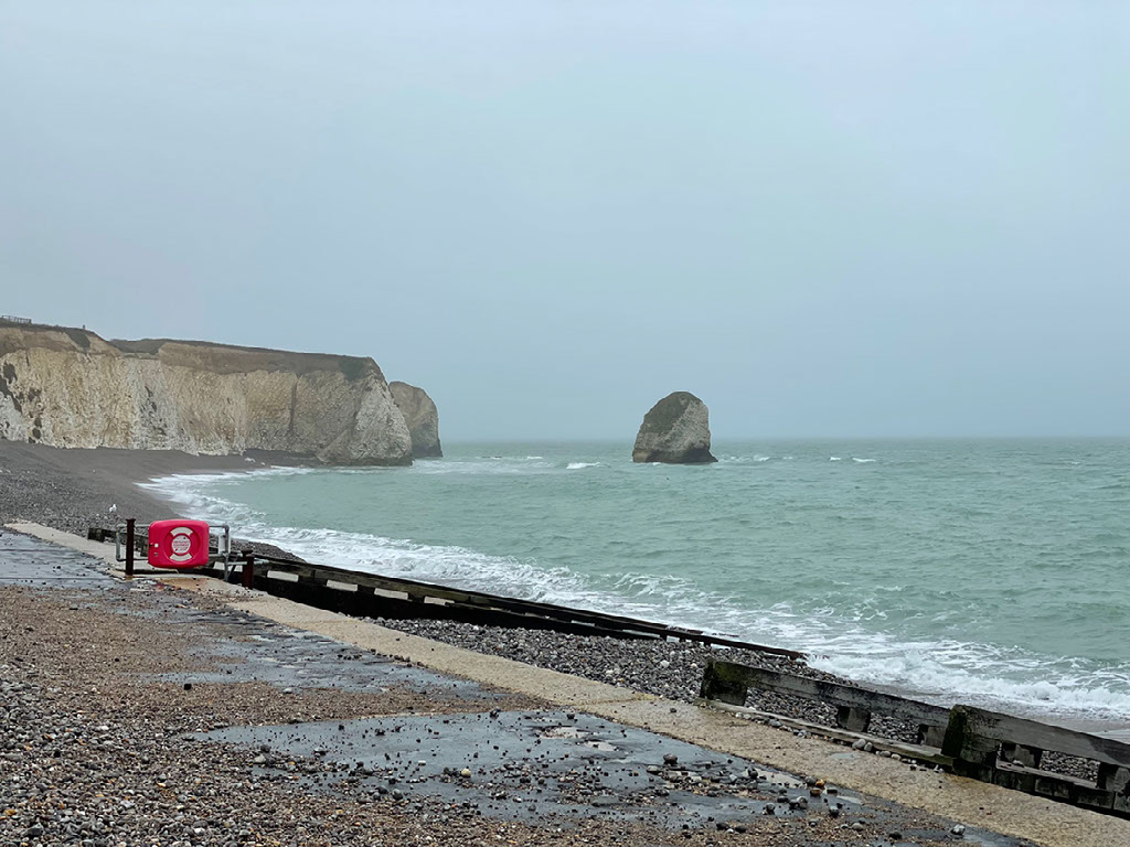 Freshwater Bay was chosen because, err, nope, can’t remember. Probably it just seemed to be the next coastal town along. It didn’t take us long to get there, past closed shops and closed museums and closed cafes. We parked at the car park opposite the beach and stepped out into the rain and wind to take a look at the sea.