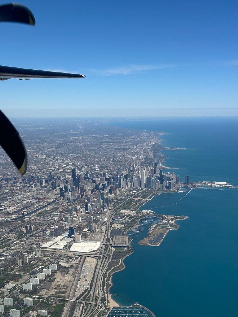 Much to my delight, I had no-one sat next to me. It’s a prop plane, a small Dash-8 with 2x2 seating and small overhead bins, but plenty of legroom and really quite comfortable seats. Very happy. We pushed back early, took off on time, and had just fantastic views of Chicago as we headed up towards Toronto.
