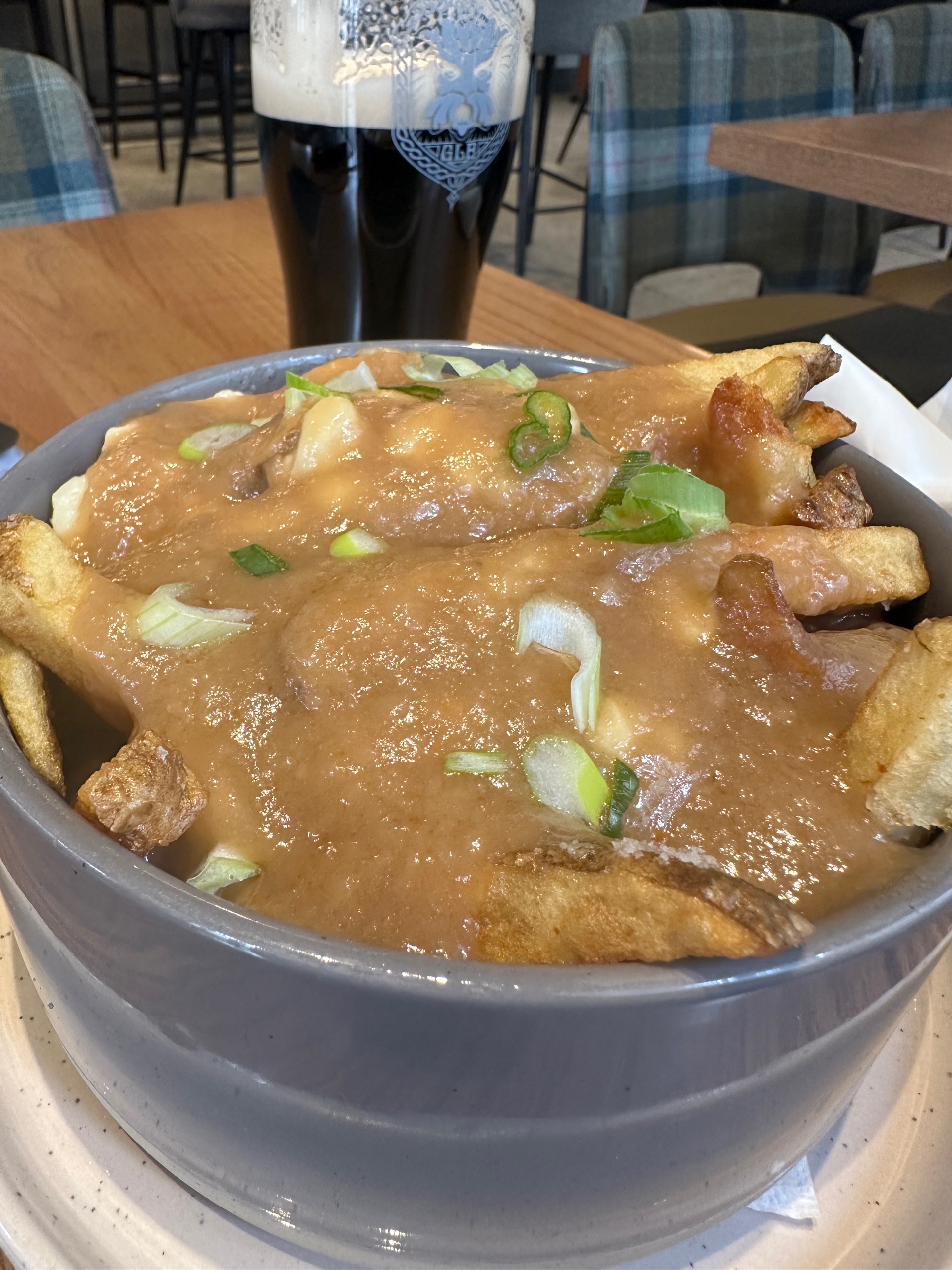 Sat down, was handed a menu but had already decided to drink their session stout and finally, FINALLY, more than 48 hours after landing in Canada, got me some damn poutine. Poutine!