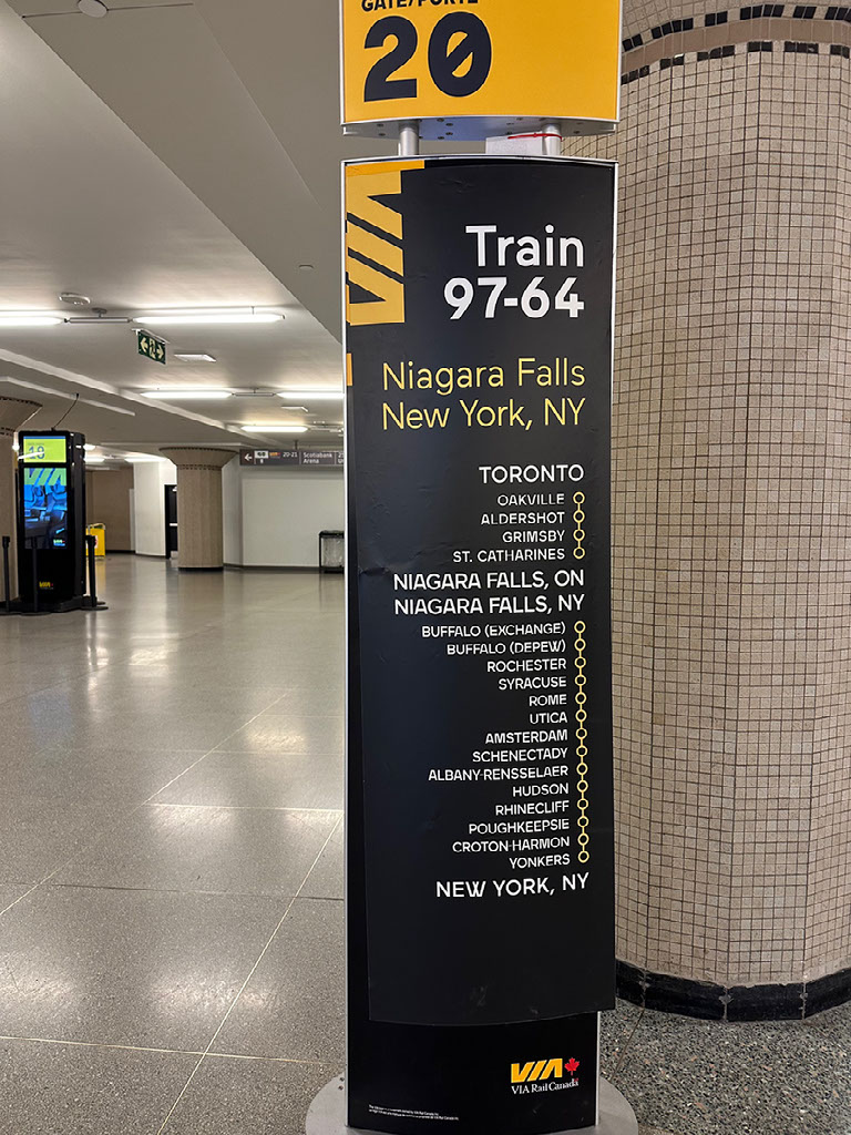 Wandered through the station and headed to the waiting area near platform 20. Dunno why I was so delighted, but I was delighted to see a big sign showing all the stops. Ontario is full of British place names, but this train heads across the border into the US and through so many excellent New York state places. Fuck yeah “oodicker” (Utica), double fuck yeah Schenectady.