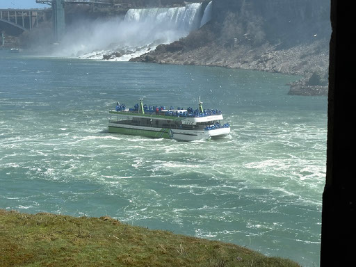 The boats go very far towards the bottom of the falls. From the top you get a good view of a load of people wearing waterproof ponchos.