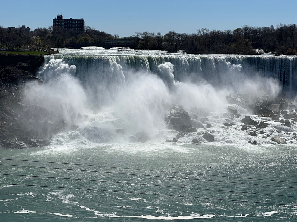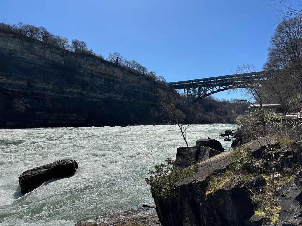 Eventually we reach Niagara Falls. We stop just outside the station first - it’s announced that this would happen - so that “engineers can do their thing”. Maybe there’s a gauge change? Silky or Lester would know. Anyway. A few minutes after that we creak into Niagara Falls ON and I’m off. There are a load of cabs outside the tiny station, most of which get a fare, but me being me I set off on foot. Hell, I’m not even heading to the waterfalls just yet - about a 5 minute walk from the station, past the bridge which goes into the USA, there’s a white water rapids attraction. And, crucially, a loo.